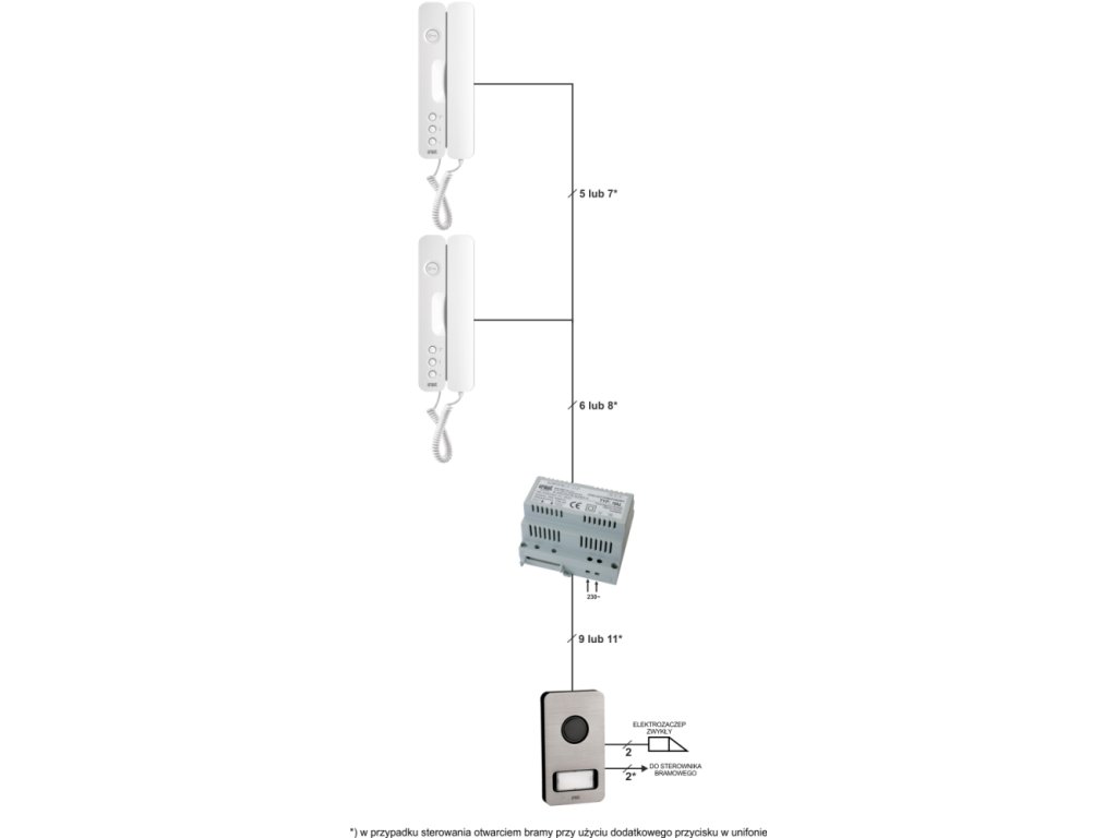 - 1 napájací zdroj domofónu 230V~/50Hz 12Vac/500mA s generátorom vyvolávacieho signálu 18A1 (DIN 6 modulová skrinka)