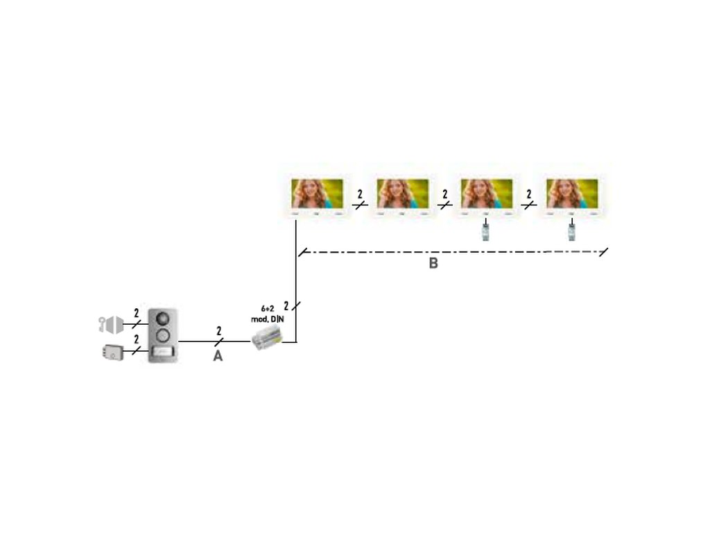 Digitálna sada videovrátnikov 1722/85 s internou pamäťou (100 obrázkov) pre rodinný dom s farebným videomonitorom cxMODO 7" a panelom MIKRA. Sada má možnosť rozšírenia o ďalšie max. 3 videomonitory. Medzi videomonitormi cxMODO je možná interkomová komunikácia. Sada videovrátnikov 1722/85 je veľmi ľahká na inštaláciu. Na spojenie medzi zariadeniami stačia dva nepolarizované drôty v celej inštalácii. Maximálna vzdialenosť inštalácie je až 150m.