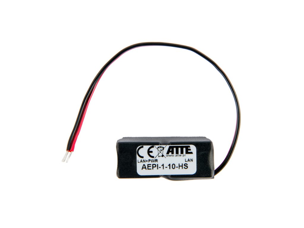 Adapter napájania / Injector PoE AEPI-1-10-HS - Atte Injector AEPI-1-10-HS je univerzálny PoE adaptér značky Atte, určený na napájanie zariadení ako prístupové body (access pointy), kamery alebo videovrátnikov IP. Adaptér pracuje podľa štandardov napájania PoE 802.3at/af alebo PASSIVE s vlastným zdrojom napájania. Maximálny výkon PoE je 40W. Zariadenie má 1 kanál RJ45 s rýchlosťou 10/100Mbps. Technické parametre: Druh adaptéra: injector napájania PoE Počet kanál: x1 Prenosová rýchlosť: 10/100 Mbps Štandard napájania PoE: 802.3at/af alebo PASSIVE PoE výkonový rozpočet: 40W Krytí: IP20 Napätie napájania: 52V DC Výstupné napätie: VOUT = VIN Ochrana proti skratu: Áno, polymérna poistka 0,75A Pracovná teplota: -25°C do 50°C Rozmery: 17 x 45 x 15 mm Hmotnosť: 0,1 kg Technická špecifikácia: AEPI-1-10-HS Všeobecné Počet kanálov x1 Funkcie portov RJ-45 (1) s LED podsvietením: VÝSTUP PoE - na prijímače PoE PASSIVE (do 40W) a 802.3af (do 15,4W), 802.3at (do 30W) RJ-45 (2): port LAN bez napájania PoE Prenosová rýchlosť dát 10/100 Mbps PoE výkonový rozpočet 40W Prenosový štandard 802.3at/af alebo PASSIVE Ochrana proti skratu Áno, Polymérna poistka 0,75A Výstupné napätie VOUT = VIN Krytí IP20 Pracovná teplota -25°C do 50°C Napätie napájania 52V DC Konštrukcia krytu Izolačná polyetylénová fólia Rozmery 17 x 45 x 15 mm Hmotnosť 0,1 kgDodatočné parametre