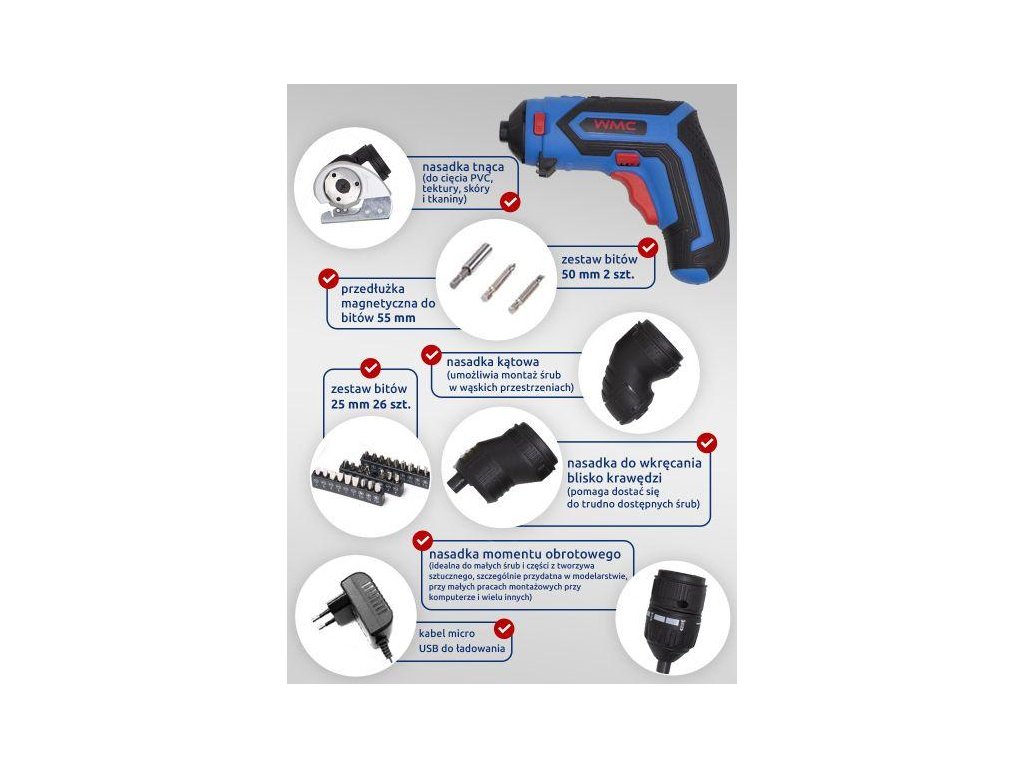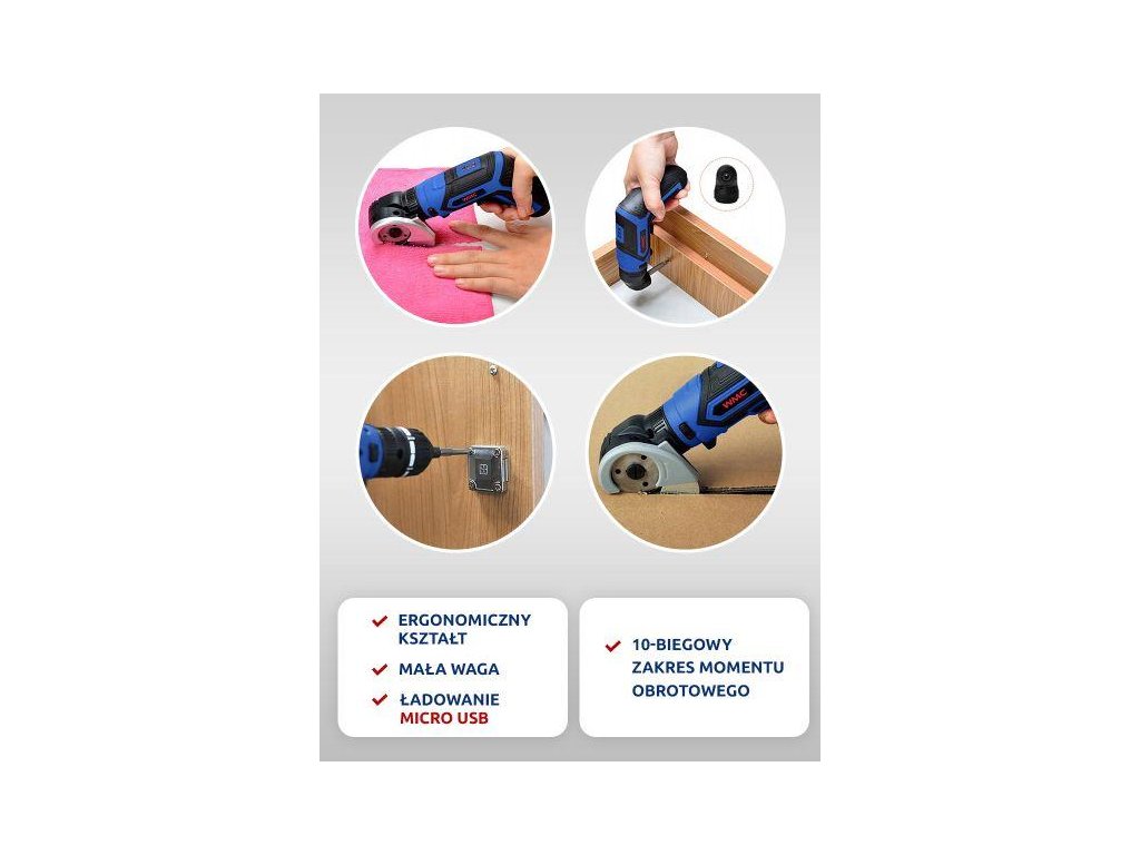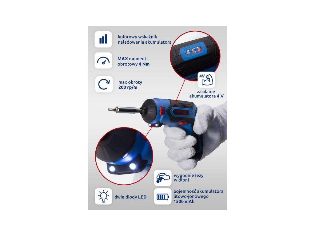 Motor napájaný silným akumulátorom 4 V s kapacitou 1500mAh. Nabíjačka priložená v sade poskytuje rýchle nabíjanie. Zariadenie má dvojpolohovú rukoväť, vďaka ktorej môže pracovať ako štandardný skrutkovač malých rozmerov alebo ako akumulátorový skrutkovač, čo výrazne zvyšuje rozsah vykonávaných prác. Úchop je pokrytý mäkkou gumou, vďaka čomu zariadenie pevne sedí v ruke. Komfort práce navyše zvyšuje nízka hmotnosť skrutkovača. LED lampička slúži ako malá baterka osvetľujúca pracovný priestor. Vďaka nej môžete pracovať aj pri nepriaznivých svetelných podmienkach.