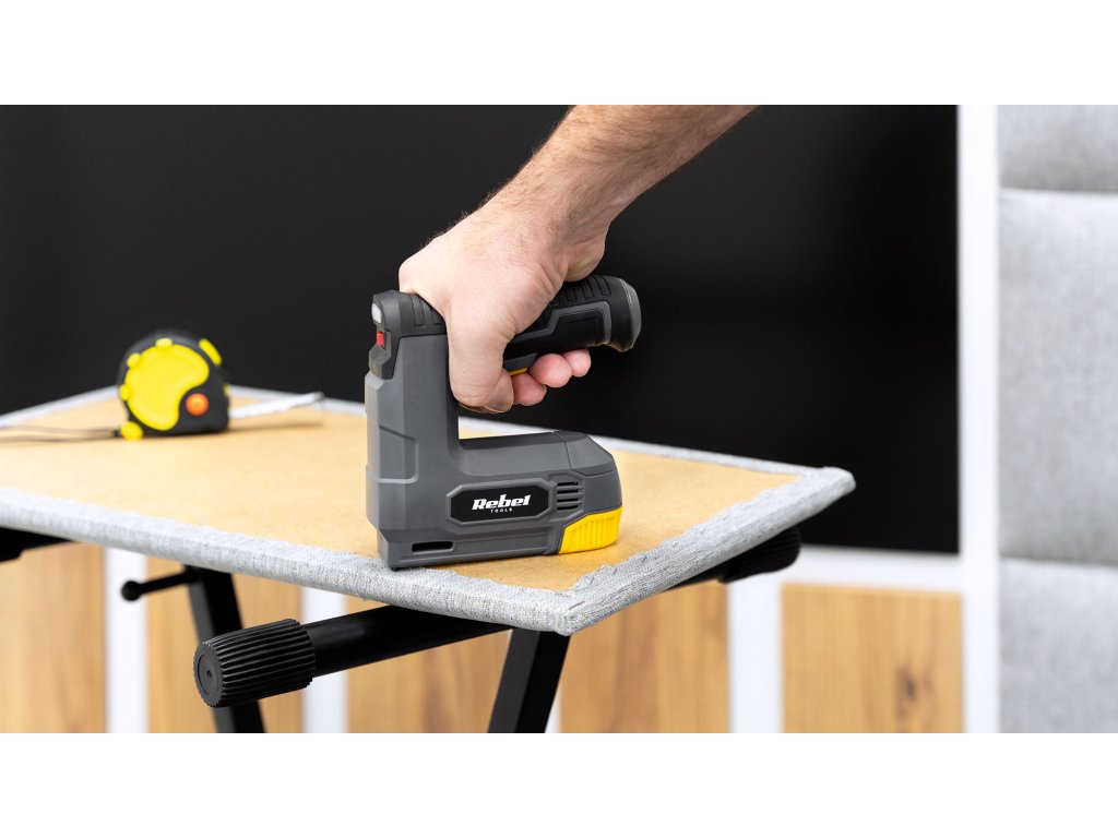 Premýšľate, ktorá zošívačka na čalúnenie je pre vás najlepšia: elektrická alebo akumulátorová? Rozhodnite sa pre jednoduché používanie a zbavte sa zbytočných a plačúcich káblov. Voľnú prácu s čalúnnickým náradím Rebel Tools zaručuje vstavaná batéria s kapacitou 1500 mAh, ktorá vystačí na niekoľko hodín nepretržitej práce v domácej dielni. Súčasťou balenia je aj kábel USB-C, aby ste mohli batériu zariadenia úplne nabiť za niekoľko hodín.