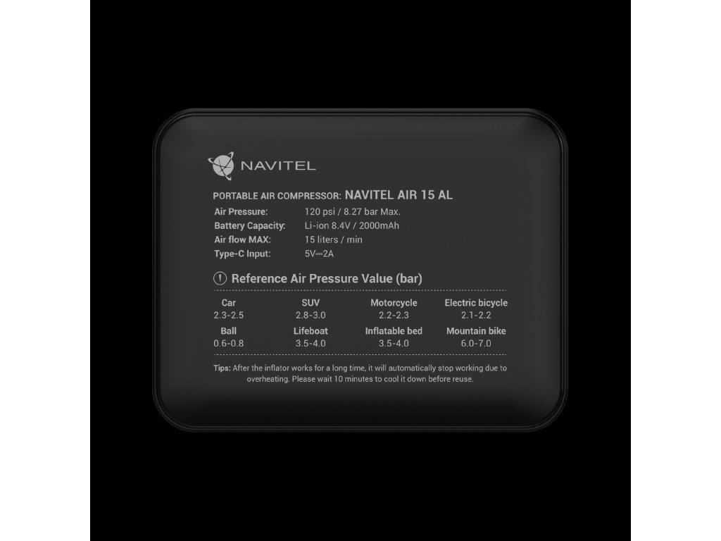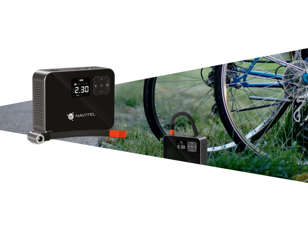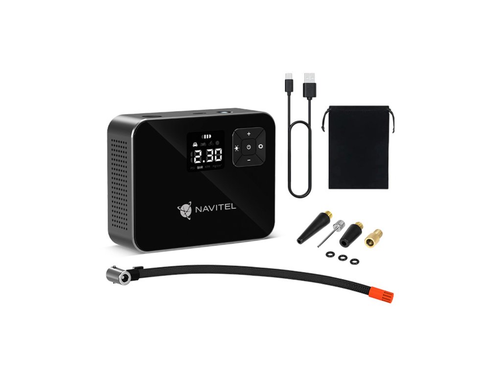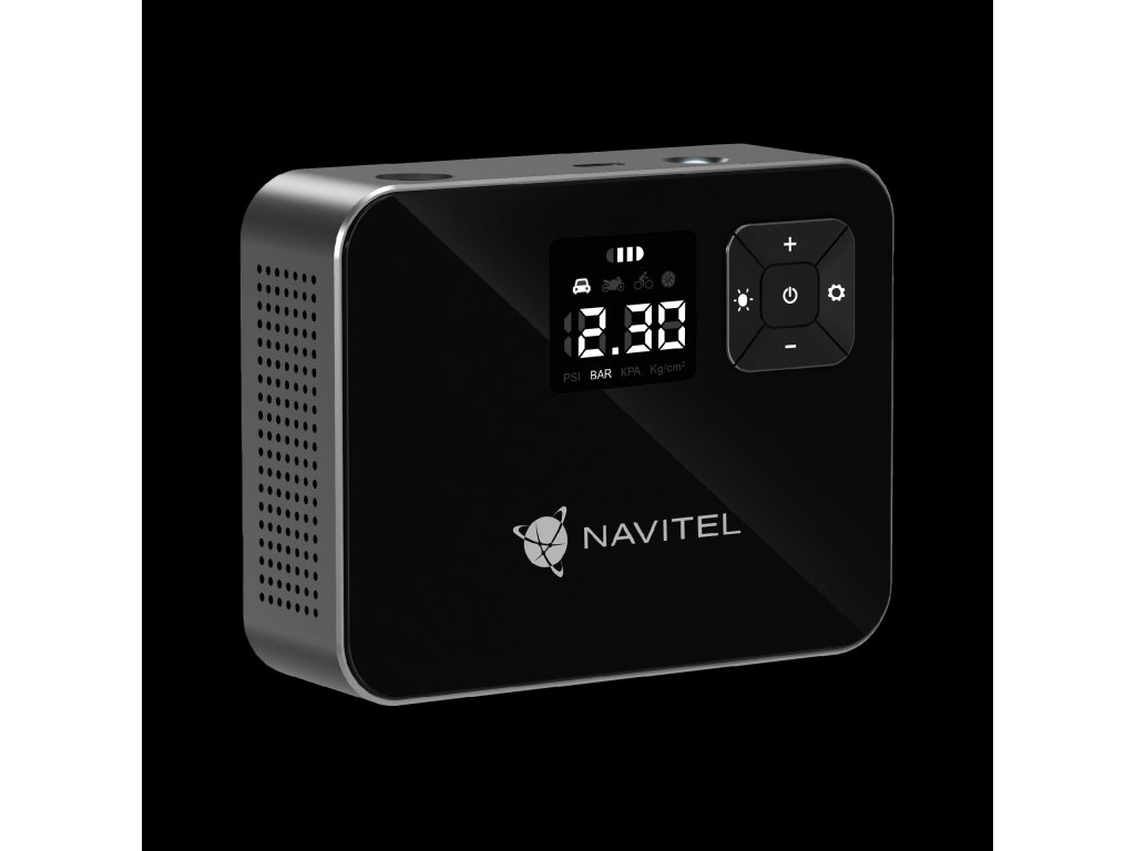 NAVITEL AIR 15 AL je batériový vzduchový kompresor s automatickým regulátorom tlaku, digitálnym tlakomerom a LCD displejom. AIR 15 AL umožňuje jednoduché nahustenie pneumatík auta, bicykla, motorky, lopty alebo hračky na plávanie. Vďaka vstavanej Li-ion batérii s kapacitou 2000 mAh funguje kompresor autonómne – bez nutnosti pripojenia do elektrickej zásuvky alebo palubnej siete vozidla.