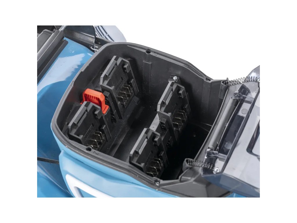 Kosačka je vybavená slotom na štyri batérie, čo umožňuje dlhodobé kosenie bez potreby prestávok na nabíjanie. Systém automatického prepínania medzi pármi batérií umožňuje nepretržitú prácu – keď sa jedna páryska vybije, zariadenie sa automaticky prepne na ďalšiu. Takéto riešenie umožňuje nepretržitú prácu dlhší čas, eliminujúc potrebu manuálneho prepínania batérií alebo čakanie na ich nabíjanie, čo rozhodne zvyšuje efektívnosť a pohodlie používania.