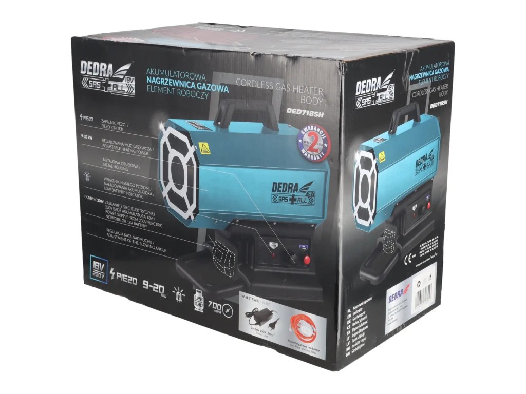 APlynové vykurovacie teleso je jedným z najobľúbenejšíchr i e š e n í na vykurovanie väčších miestností, ktorých objem si vyžaduje veľký vykurovací výkon. Plynové ohrievače si však vyžadujú napájanie so zabudovaným ventilátorom, ktorý uľahčuje vykurovanie miestnosti. To spôsobuje problém, keď nie je k dispozícii elektrina a je potrebné veľké množstvo tepla. Na uspokojenie týchto potrieb spoločnosť DEDRA predstavila plynový ohrievač, ktorý je napájaný z 230V zásuvky aj z batériovej varianty s systém SAS+ALL s jednou batériou Vďaka napájaniu 18 V je možné plynový ohrievač používať aj na miestach bez elektrickej energie, napr. na staveniskách, v samostatných garážach atď. Ohrievač má nastaviteľný tepelnývýkon od 9 do 20 kW a kovový plášť zaručuje vysokú životnosť a odolnosť voči mechanickému poškodeniu. DED7185H je vybavený indikátorom vybitia batérie na bočnom paneli, ktorý umožňuje jednoduchú kontrolu stavu batérie bez toho, aby ste museli zastaviť ohrievač alebo manipulovať s jeho polohou. DED7185H je vybavený nastaviteľným uhlom ventilátora,vďaka čomu sa pohodlnepoužíva na miestach s obmedzeným priestorom. Okrem ohrievača súprava obsahuje plynovú hadicu s regulátorom a 230V napájací zdroj na napájanie ohrievača priamo z elektrického systému.