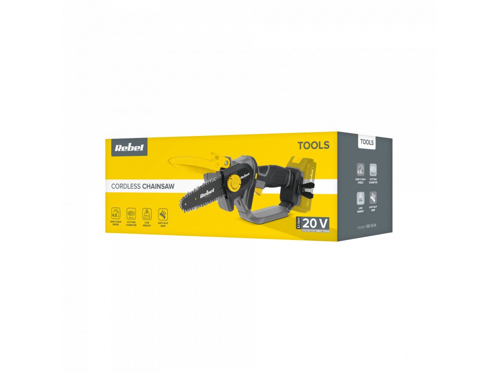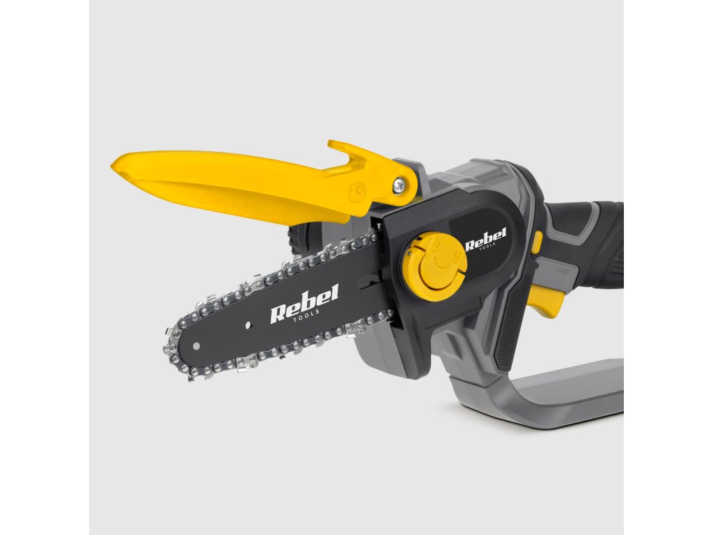 Mini akumulátorová píla Rebel je navrhnutá tak, aby umožňovala jednoduchú obsluhu pri orezávaní stromov a konárov. Zariadenie je vybavené odolným, no ľahkým telom, vďaka čomu sa ľahko prenáša. Vďaka tomuto nástroju môžete voľne manévrovať medzi hustými konármi a dosiahnuť presné rezy.