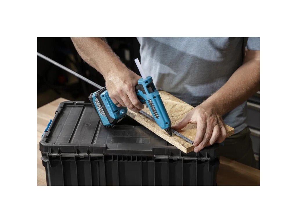>S tavnou lepiacou pištoľou môžete spájať materiály, ako je drevo, plast, kov, koža alebo guma. Komponenty s a spájajú pomocou lepiacich kaziet s priemerom 11 mm. Pištoľ sa vyznačuje ľahkou a odolnou konštrukciou a je veľmi praktická a pohodlná pri práci. Pištoľ používajú profesionáli, domáci majstri aj dekoratéri (decoupage). Pištoľ je napájaná nabíjateľnou batériou, čo umožňuje prácu na miestach, kde nie je možné pripojenie k elektrickej sieti, napr. v prípade výpadku prúdu alebo na parkovisku či v záhrade. Ergonomicky tvarovaná zaoblená rukoväť poskytuje vynikajúci komfort pri používaní. Rýchle zahriatie za 3 minúty umožňuje dosiahnuť maximálnu teplotu 180 stupňov Celzia, čím sa zabezpečí roztavenie lepidla v krátkom čase.Vypínač pod palcom zabraňuje bezpečnému zapnutiu stroja. Pohodlný blank umožňuje podávať lepidlo cez trysku rýchlosťou 15 g/min. PodsvietenieLED umožňuje pohodlnejšiu prácu v oblastiach so slabým osvetlením.