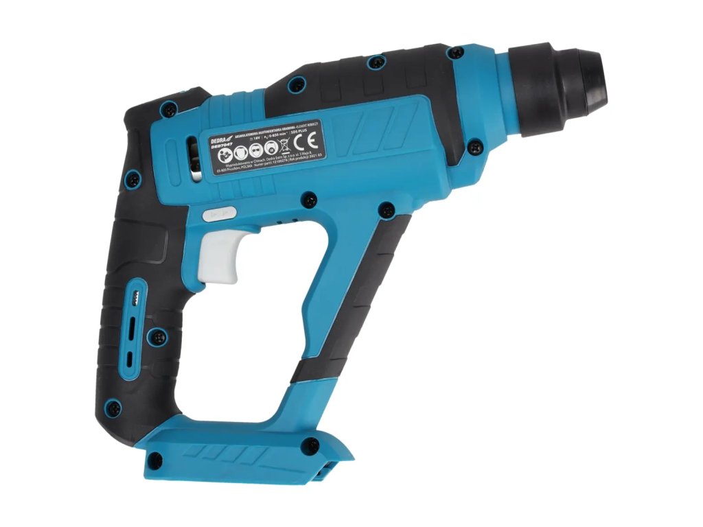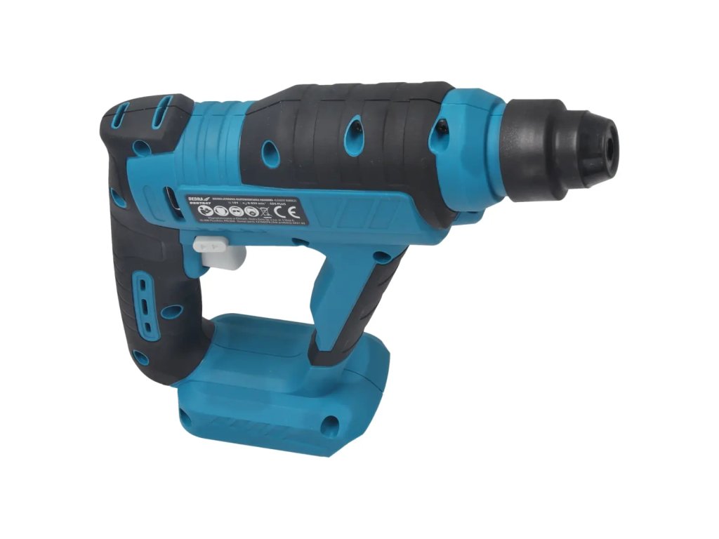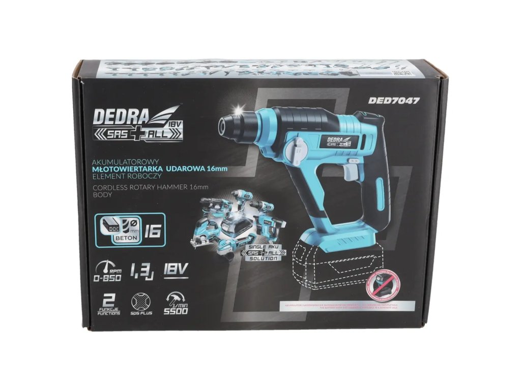 Jedná sa o ľahký, kompaktný nástroj určený na vŕtanie otvorov do stavebných materiálov, ako je betón, tehla,omietka atď. Vŕtačka má bočný prepínač, ktorý umožňuje používateľovi zvoliť 2 režimy prevádzky: vŕtanie, príklep a úder. Pomocou bočného prepínača môžeme zvoliť 2 režimy prevádzky: vŕtanie, vŕtanie s príklepom. Stroj má energiu úderu1,3 J, čo v kombinácii s vysokou rýchlosťou úderu 5500 úderov za minútu postačuje na ľahké montážne a dokončovacie práce. Plášť jevyrobený z nylonu vystuženého sklenými vláknami, čo zvyšuje odolnosť voči mechanickému poškodeniu a UV žiareniu. Ergonómiu apohodlie zlepšuje nízka hmotnosť a veľkosť nástroja, ako aj ergonomický dizajn rukoväte.Vlastnostiakumulátorového vŕtacieho kladiva DEDRA SAS+ALL DED7047:
