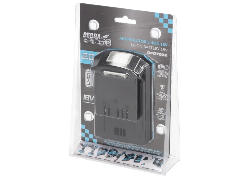 Táto batéria s kapacitou 2,0 Ah je základným produktom na napájanie nabíjateľného náradia zo série SAS+ALL. Batéria jevyrobená lítiovo-iónovou technológiou, čo znamená, že ju možno kedykoľvek dobíjať bez tzv. pamäťového efektu. Tri LED diódy na kryte batérie indikujú aktuálny stav nabíjania (100% stav nabitia) . Spodná časť krytu je potiahnutá gumou pre väčšie pohodlie a bezpečnosť pred náhodným poškodením.