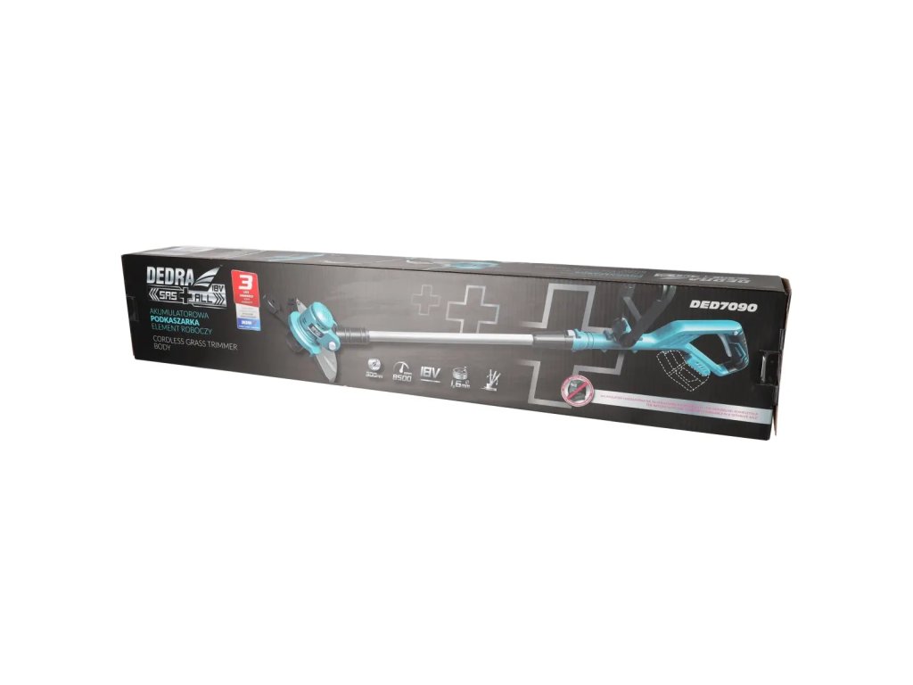 Technické údaje 18V akumulátorovej strunovej kosačky na trávu DEDRA SAS+ALL DED7090:
