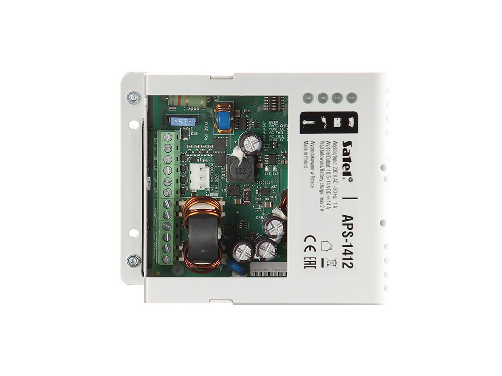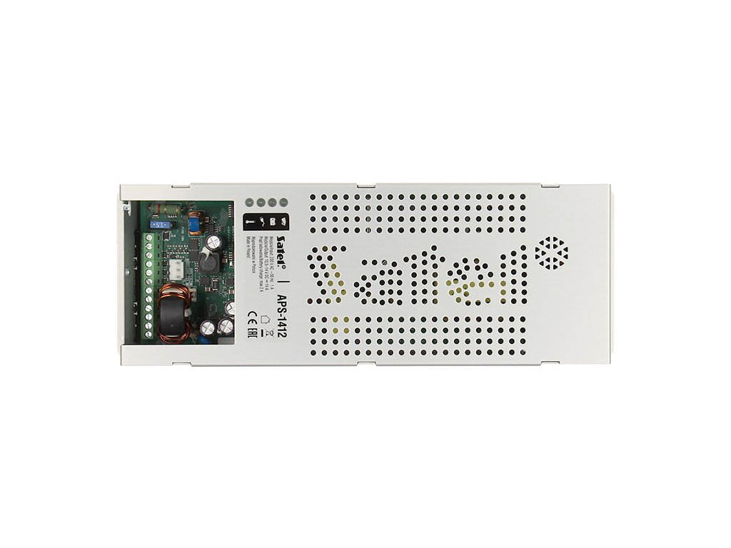 APS-1412 je impulzný záložný napájací zdroj určený na napájanie zariadení vyžadujúcich jednosmerné napätie 12 V. Má vysokú prúdovú účinnosť 14A a energetickú účinnosť dosahujúcu 92%. Napájací zdroj je zhodný s normou EN 55011 Class B, čo sa týka úrovne vedenej a žiarenej rušivosti EMI. Okrem toho spĺňa bezpečnostné normy EN 60950-1 a požiadavky EN 50131-3 pre Grade 2. APS-1412 má filtre proti rušeniu (na vstupe a výstupe) a aktívne obvody korekcie účinníka - až do 0,99, čo zabezpečuje stabilné prevádzkové parametre aj pri veľkých výkyvoch napájacieho napätia. Napájací zdroj kontroluje stav nabitia akumulátora a obsahuje ochranu proti jeho nadmernému vybití, čo umožňuje minimalizovať riziko poškodenia núdzového zdroja napájania. APS-1412 je vybavený štyrmi výstupmi OC, ktoré môžu signalizovať poruchu. Na obale zariadenia sa nachádzajú štyri LED diódy, ktoré signalizujú: stav napájacieho výstupu, stav akumulátora, stav AC napájania, príliš vysokú teplotu napájacieho zdroja. Napájací zdroj má ochranu proti skratu (SCP) a ochranu proti preťaženiu (OCP). Na pripojenie napájacieho kábla slúži konektor IEC C14.