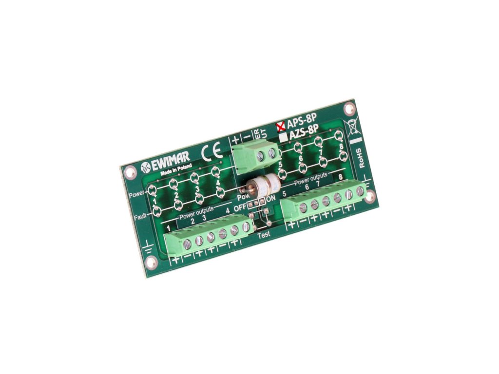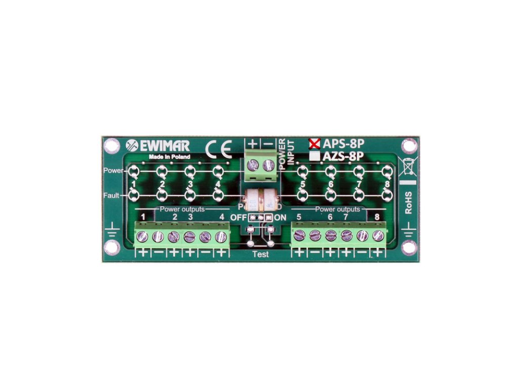APS-8P je ochrana proti prepätiu, ktorej úlohou je chrániť a separovať napájanie snímačov systémov alarmov triedy S pred dôsledkami atmosférických výbojov. Zariadenie má 8 ochranných obvodov vybavených super rýchlymi poistkami MOSFET, ktoré v priebehu 1 uS rozpoja napájací obvod, kde došlo ku skrat. Toto riešenie zabraňuje odpojeniu napájania a vypnutiu iných snímačov alarmového systému sabotáže, bez toho, aby spôsobilo prúdové zaťaženie zdroja a akumulátora. Skrat môže pretrvávať akokoľvek dlhý čas. Po odstránení skratu sa napájanie do vypnutého obvodu automaticky obnoví. Ochrana má vstavanú funkciu ochrany pred prepätím. Táto funkčnosť zabezpečuje alarmové linky ústredne pred poškodením dôsledkom atmosférických výbojov a rázových prúdov do hodnoty 2kA. Ochranný obvod odvádza indukované potenciály na zem prostredníctvom PE linky. APS-8P je vyhotovený v podobe modulu inštalovaného v špeciálnom kryte spolu s inými modulmi, ktoré môžu tvoriť komplexný ochranný systém pre všetky signály alarmovej centrálnej jednotky. Pre úplnú ochranu proti prepätiu 8 alarmových liniek sa odporúča použitie ochrany v kombinácii s modulom APS-8Zi/1P