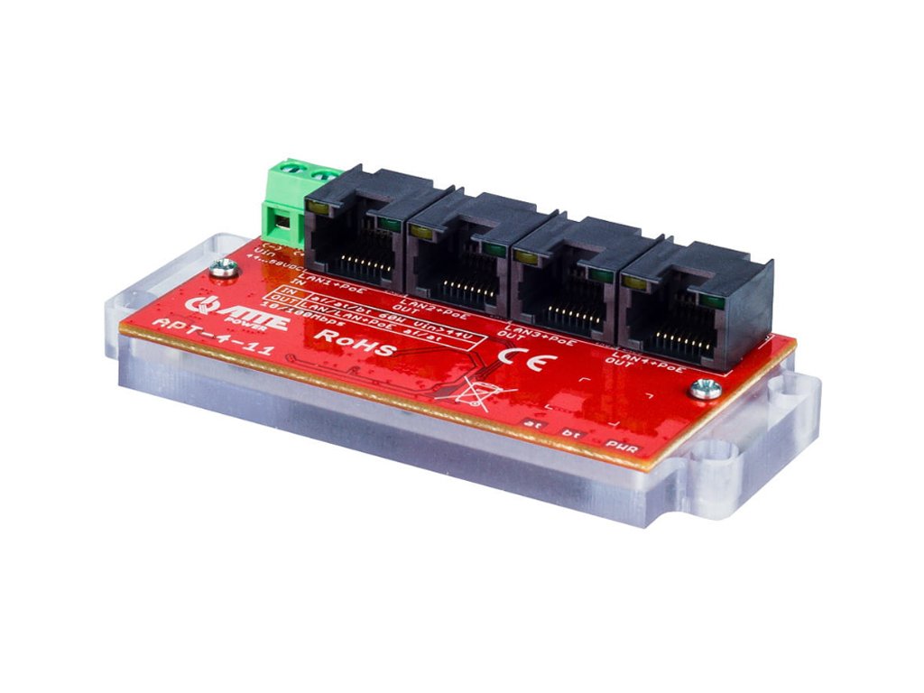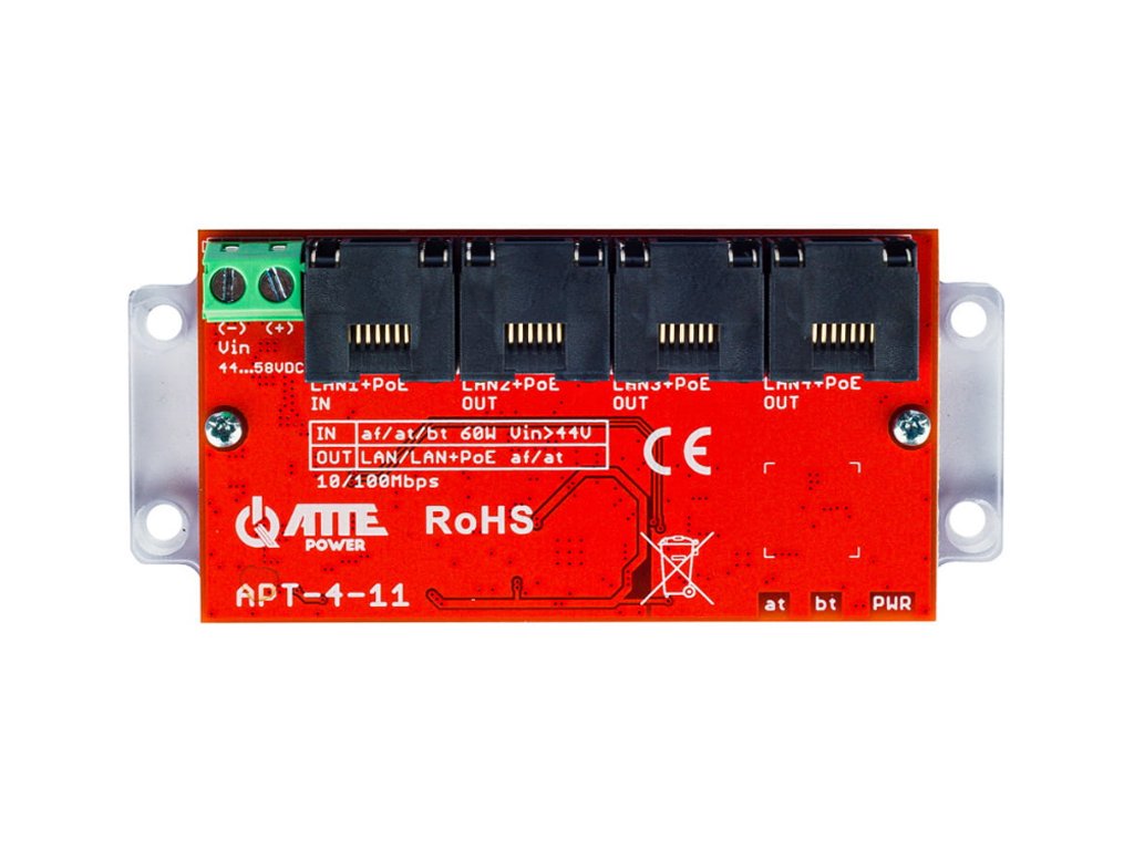 APT-4-11 je sieťovým prepínačom PoE, ktorý funguje ako extender (repeater) LAN siete a napájania PoE. Zariadenie spolupracuje s IP kamerami a inými sieťovými zariadeniami napájanými v štandarde PoE 802.3at/af alebo PoE PASSIVE. Zariadenie má 4 porty RJ45 10/100Mbps.