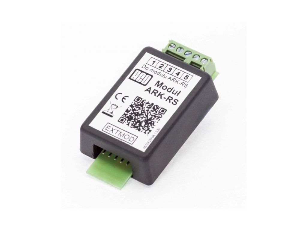 Modul ARK-RS slúžiaci na predĺženie spojenia medzi konektorom EXTMOD v centrách/paneloch a modulmi, ktoré sú pripojené k tomuto konektoru. Súprava sa skladá z dvoch modulov ARK-RS. Jeden umiestňujeme pri centrále/paneli a druhý pri moduloch. Adaptéry treba pripojiť 5-žilovým káblom cez skrutkové svorky ARK. Vzhľadom na prenos údajov v kábli môže maximálna jeho dĺžka závisieť od vonkajších rušení, preto ju treba overiť v konkrétnych prípadoch.