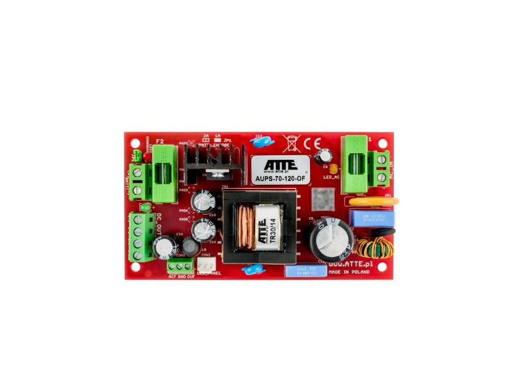 - dedikované technické výstupy ACF a OUD na integráciu bufferového zdroja ATTE AUPS-70-120-OF s vonkajšími systémami a na kontrolu práce