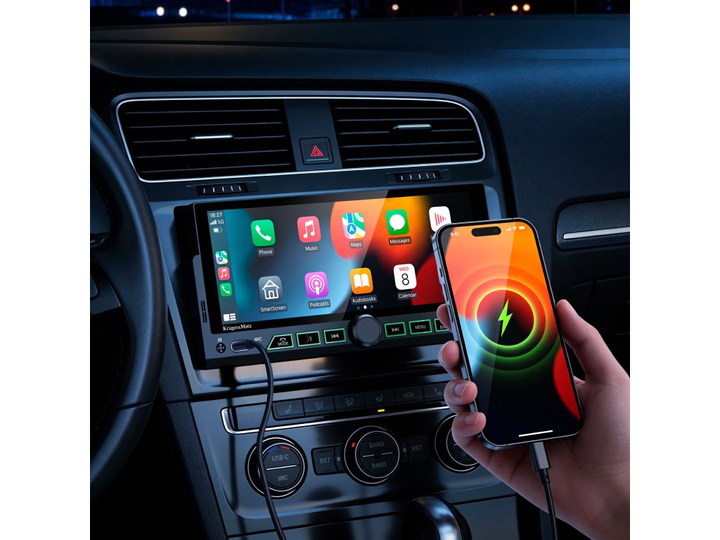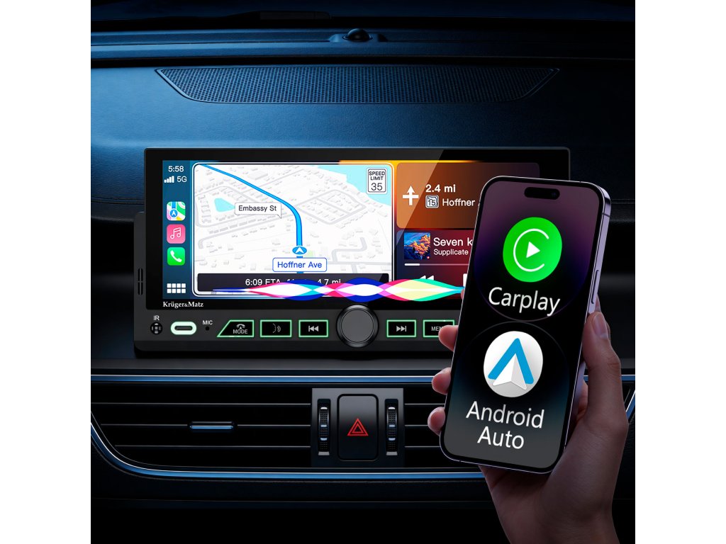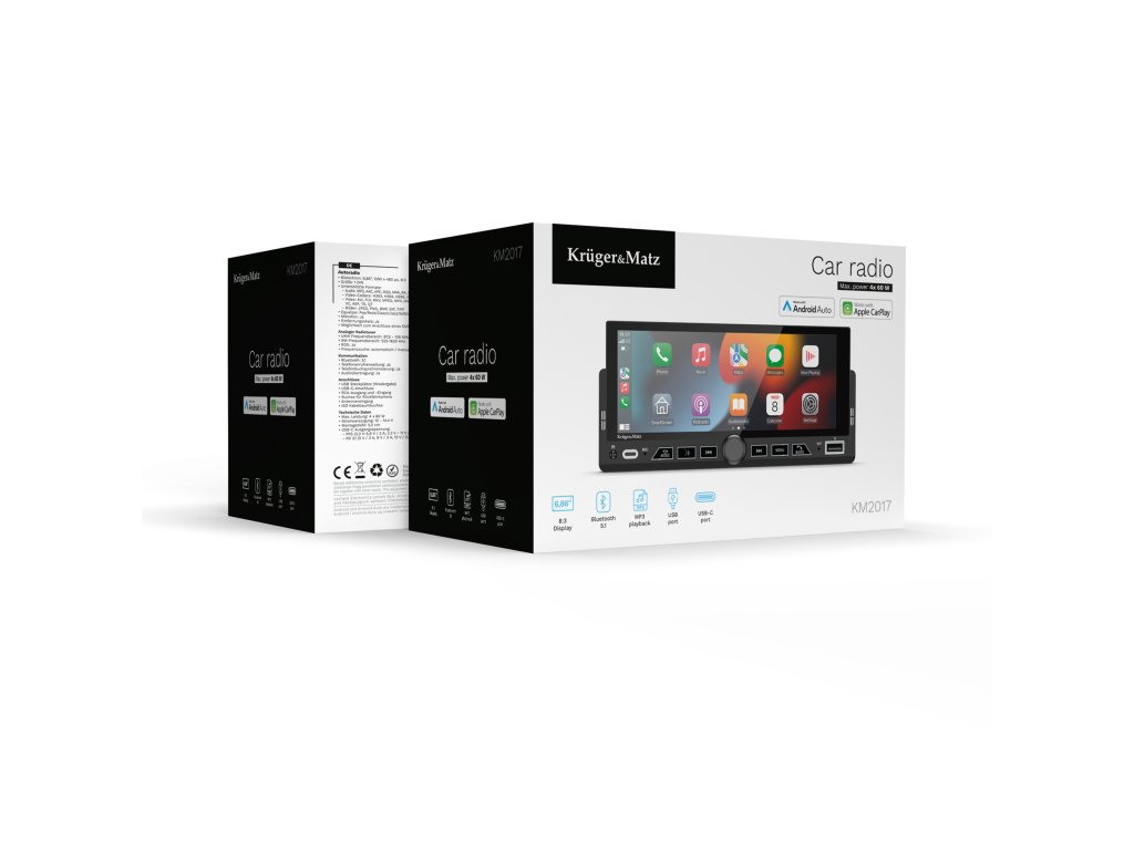 Rádio Kruger&Matz KM2017 podporuje Android Auto a Apple CarPlay, čím umožňuje bezpečné používanie aplikácií smartfónu počas jazdy. Navigácia Google Maps alebo Apple Maps, Spotify, YouTube Music alebo hlasové volania sú dostupné priamo na displeji rádia, čo zvyšuje komfort a bezpečnosť cestovania.