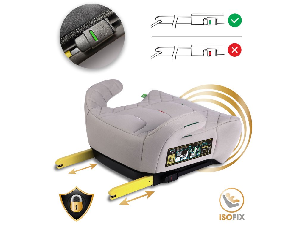 Montáž pomocou Isofixu a bezpečnostných pásov auta. Riešenie vhodné pre väčšinu modelov áut. Systém Isofix zabezpečuje dodatočnú stabilizáciu a bezvýhradnú bezpečnosť počas jazdy.