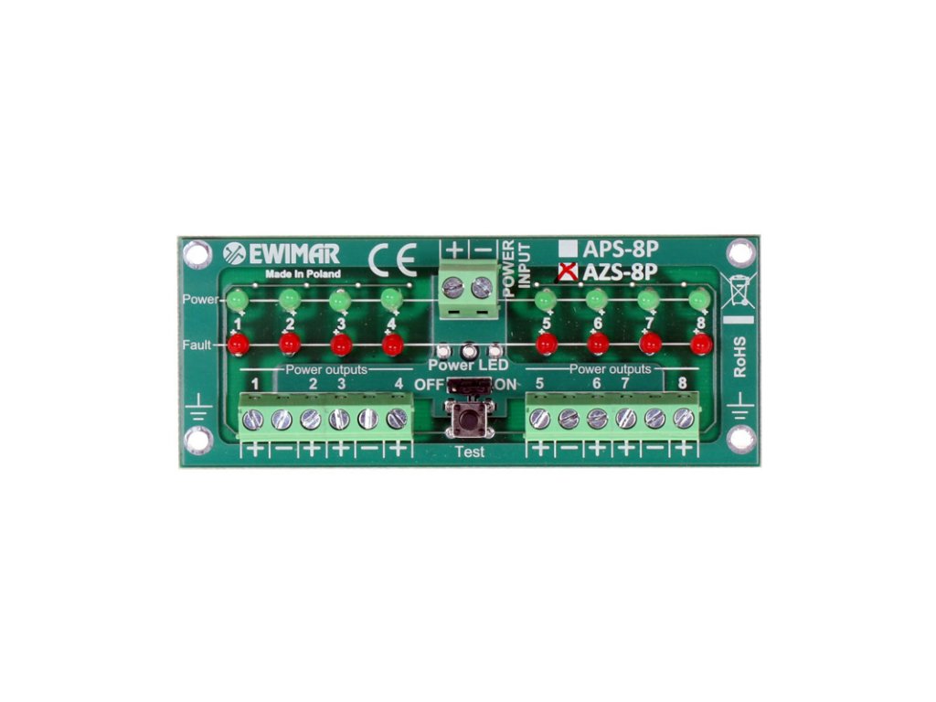 AZS-8P je prepäťová ochrana, ktorej úlohou je zabezpečiť efektívnu a bezúdržbovú separáciu napájania alarmových snímačov v systémoch triedy S. Zariadenie využíva super rýchle poistky MOSFET, vďaka čomu skrat v napájaní na jednom zo snímačov spôsobí odpojenie len jedného obvodu v čase 1uS, bez toho, aby zaťažovalo napájací zdroj alarmovej ústredne, a môže trvať neobmedzene dlho. Napájanie sa obnoví okamžite po zaniknutí skrat v obvode bez potreby akejkoľvek údržby. Prúdová kapacita je 100mA. V závislosti od celkovej spotreby prúdu je táto hodnota dostatočná na napájanie viacerých snímačov. Zariadenie má zabudované diódy, ktoré signalizujú stav poruchy a umožňujú čítať stav napájania každého kanála. Pri výskyte skratu v obvode sa rozsvietia červené diódy. Naopak, zelené signalizujú prítomnosť napätia na jednotlivých kanáloch. Predvolene sú tieto diódy zhasnuté, aby sa nevytváralo ďalšie zaťaženie pre napájací zdroj / batériu. Pomocou testovacieho tlačidla ich možno dočasne zapnúť. Diódy sa môžu zapnúť natrvalo pomocou prepojky.