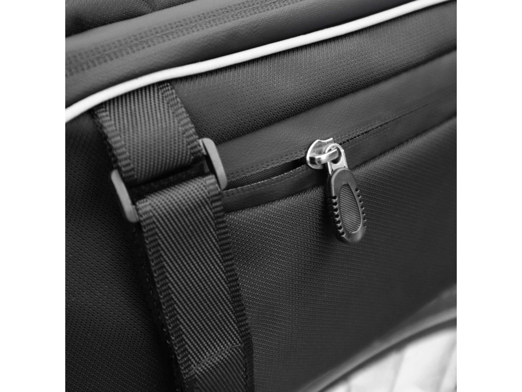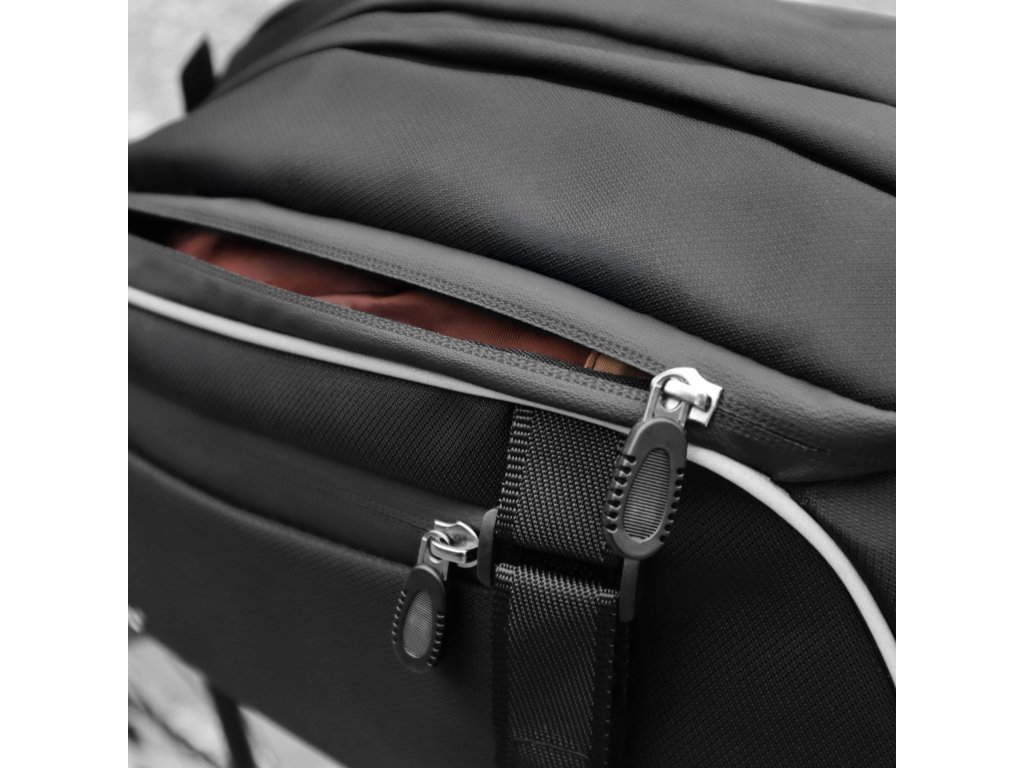 - Dve veľké, vonkajšie vrecká na zips na bokoch tašky + vrecko na zips na vonkajšej strane klopy