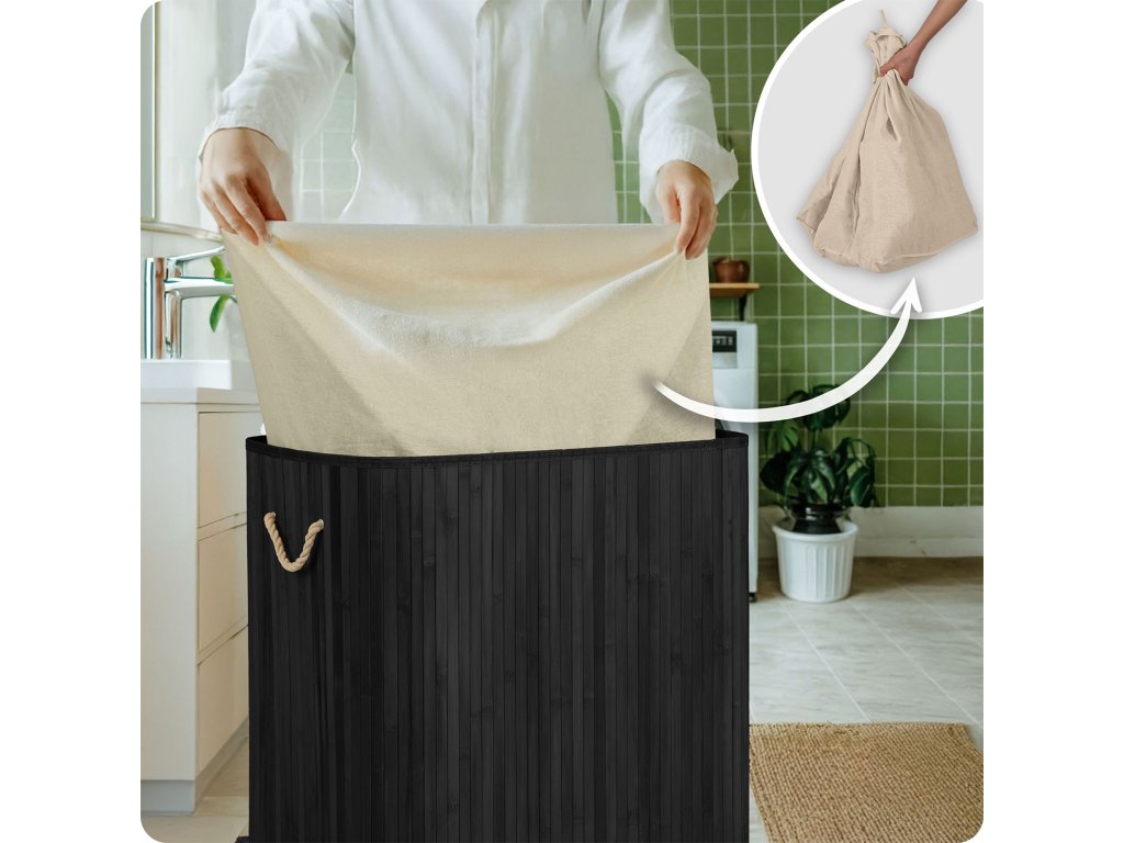 Vložka z prírodnej bavlny mení kôš na praktický vrece na pranie. Po naplnení ju stačí vytiahnuť, zviazať a preniesť do pračky – ušetríte čas, vyhnete sa neporiadku a zachováte čistotu.