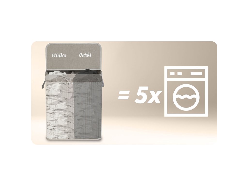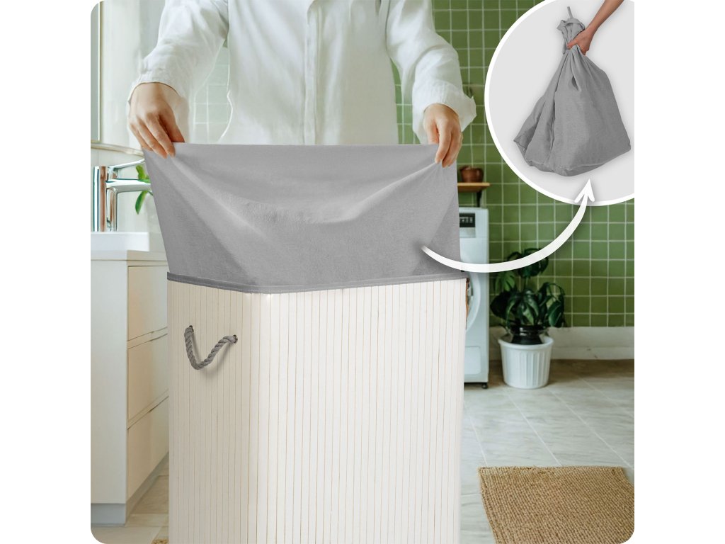 Vložka z prírodnej bavlny premieňa kôš na praktický vak na prádlo. Po naplnení stačí ju vytiahnuť, zviazať a preniesť do práčky – šetríte čas, vyhýbate sa neporiadku a udržiavate čistotu.