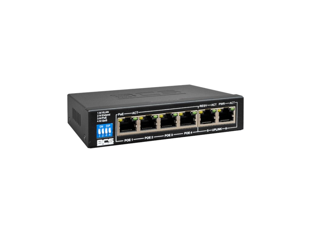 BCS-B-SP0402 je nezariadený switch vybavený 4 portami RJ45 PoE 100Mbps a 2 portami RJ45 Uplink. Zariadenie je určené na napájanie IP kamier pracujúcich v štandarde IEEE802.3 af/at. Maximálny výkon switcha je 60W (max. 36W na jeden port). Produkt má funkciu VLAN, MDI/MDX. Zariadenie pracuje v režimoch AI VLAN, AI EXTEND, AI PoE, AI QoS. Switch BCS-B-SP0402 zaručuje plynulý prenos v sieti rýchlosťou PoE - 10 / 100 Mb/s, UPLINK (RJ45) - 10 / 100 Mb/s. Zariadenie funguje ako elektronická ochrana pripojených kamier. Použitá technológia PoE umožňuje simultánny prenos dát a napájanie kamier PoE po tom istom kábli UTP. Toto riešenie umožňuje zníženie množstva kabeláže v inštalácii. BCS-B-SP0402 je vybavený kovovým puzdrom.