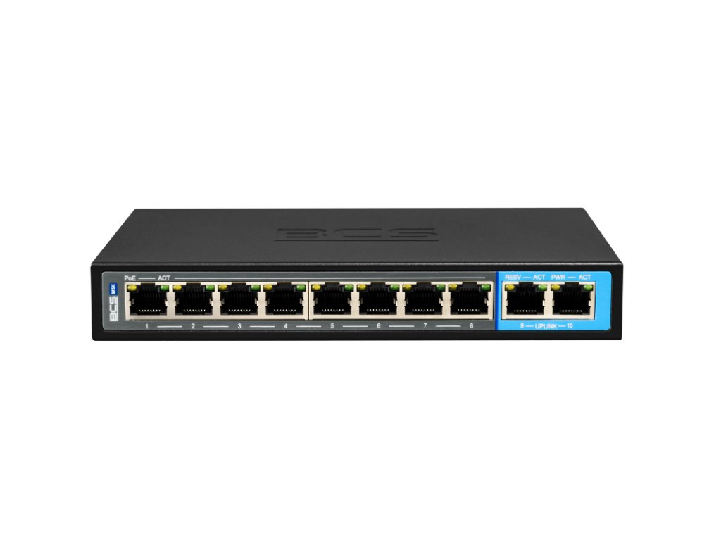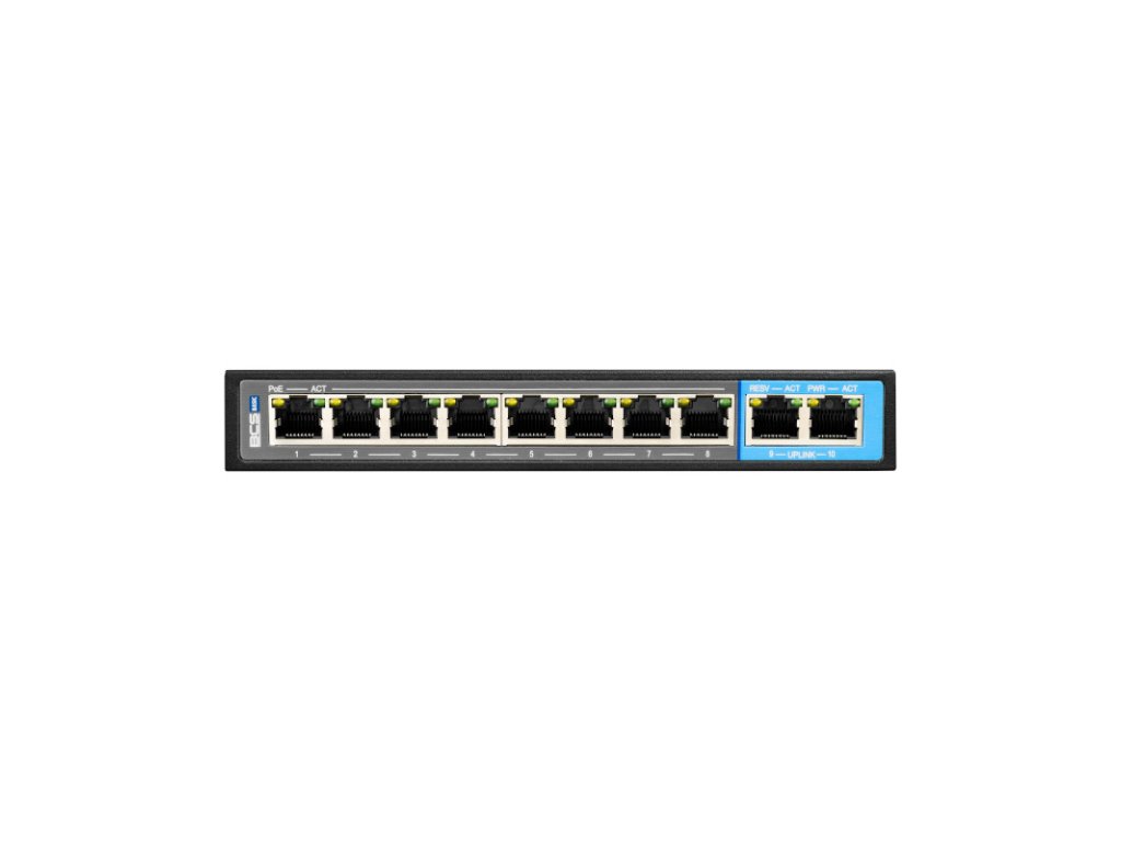 Switch sieťový BCS-B-SP0802G to nezvládnutý model PoE, vybavený 8 portami RJ45 PoE 100Mbps a 2 portami RJ45 Uplink 100/1000Mbps.