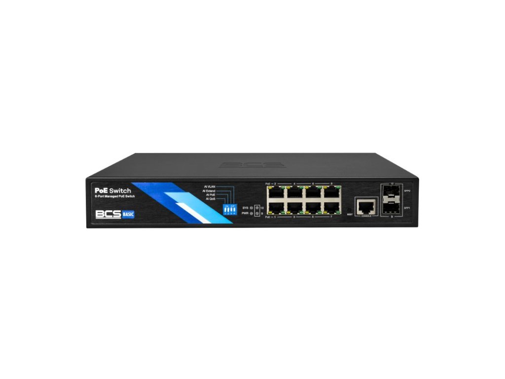 BCS-B-SP08G-2SFP-M je riadený switch vybavený 8 portami PoE 1000Mbps a ďalšími 2 portami SFP Gigabit umožňujúcimi inštaláciu optických vlákien. Zariadenie je určené na napájanie IP kamier pracujúcich v štandarde IEEE802.3 af/at. Maximálny výkon switcha je 150W (max. 46W na jeden port). Produkt má funkciu VLAN, MDI/MDX. Zariadenie pracuje v režimoch AI VLAN, AI EXTEND, AI PoE, AI QoS. Switch BCS-B-SP08G-2SFP-M zaručuje plynulý prenos siete s rýchlosťou PoE - 10 / 100 / 1000 Mb/s. Zariadenie plní funkciu ochrany elektroniky pripojených kamier. Technológia PoE použitá v produkte umožňuje súčasný prenos dát a napájanie PoE kamier po tom istom UTP kábli. Toto riešenie umožňuje znížiť množstvo kabeláže v inštalácii.
