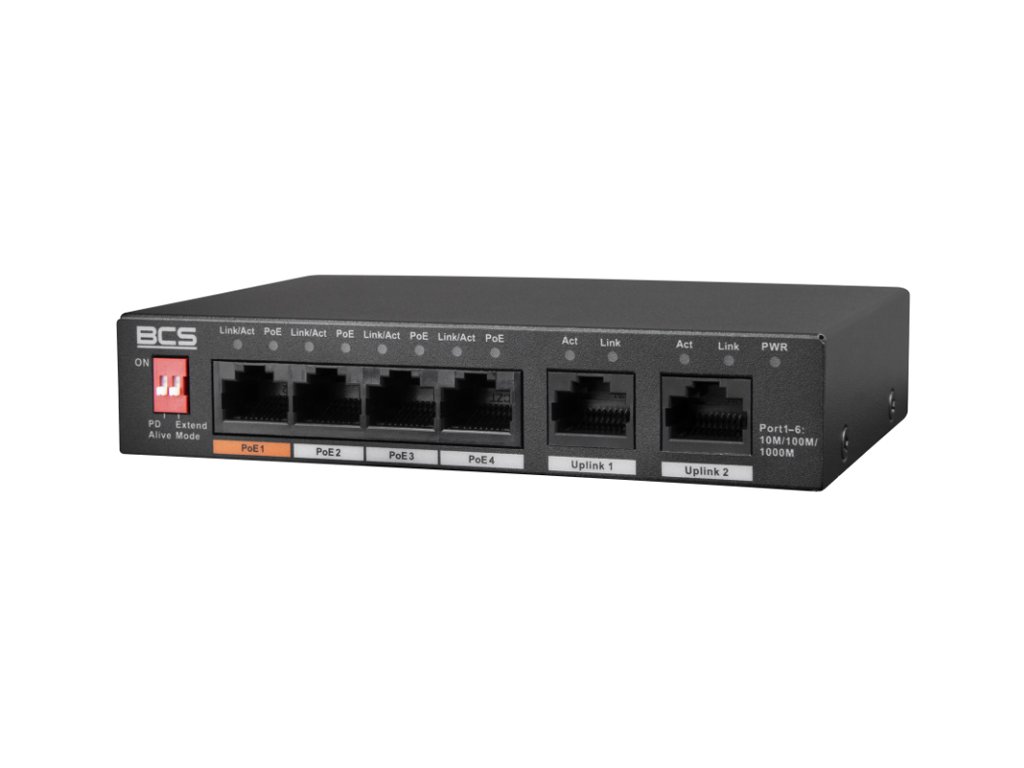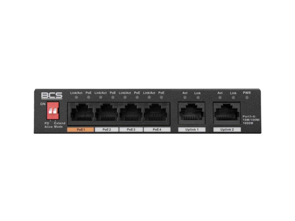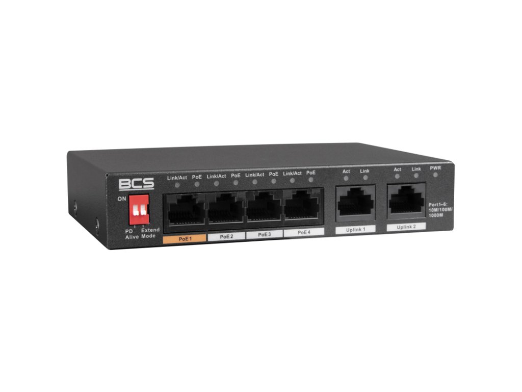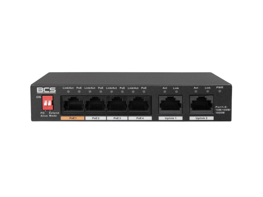 BCS-L-SP04G02G(2) je sieťový prepínač typu PoE. Zariadenie má 4 porty RJ45 1Gbps s podporou technológie napájania PoE v štandardoch 802.3af / 802.3at / 802.3bt / 802.3 / 802.3u / 802.3x / 802.3ab a 2 gigabitové uplinkové porty RJ45. Energetický rozpočet PoE zariadenia je 60W pre celý prepínač a až 30W pre jeden port. Tento model sa vyznačuje vysokou priepustnosťou na úrovni 14 Gbps.