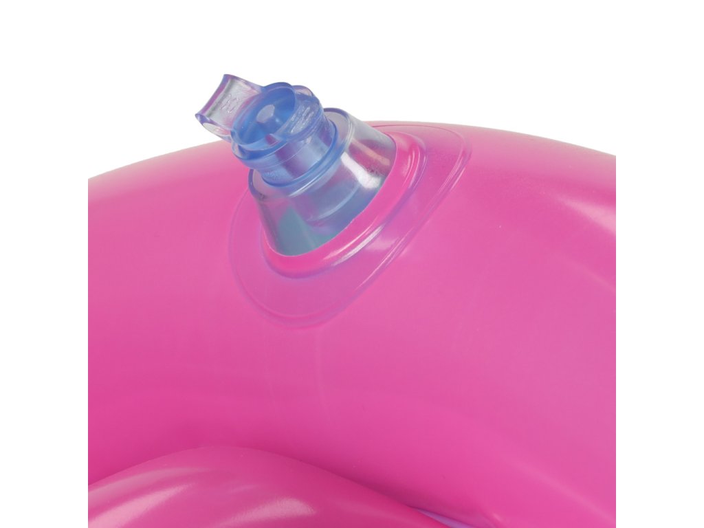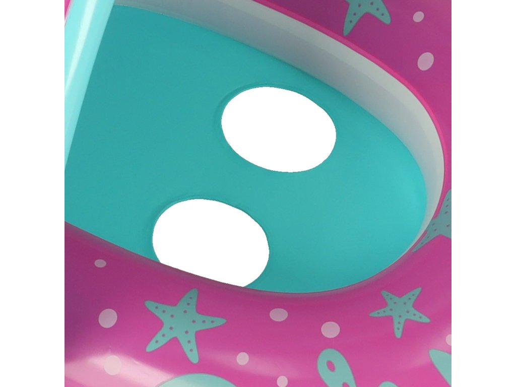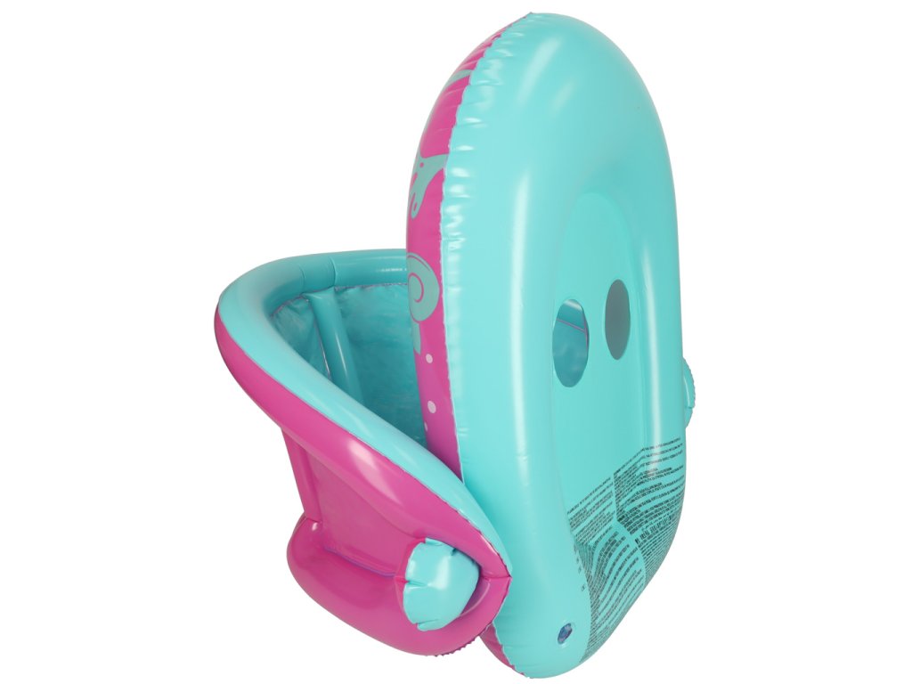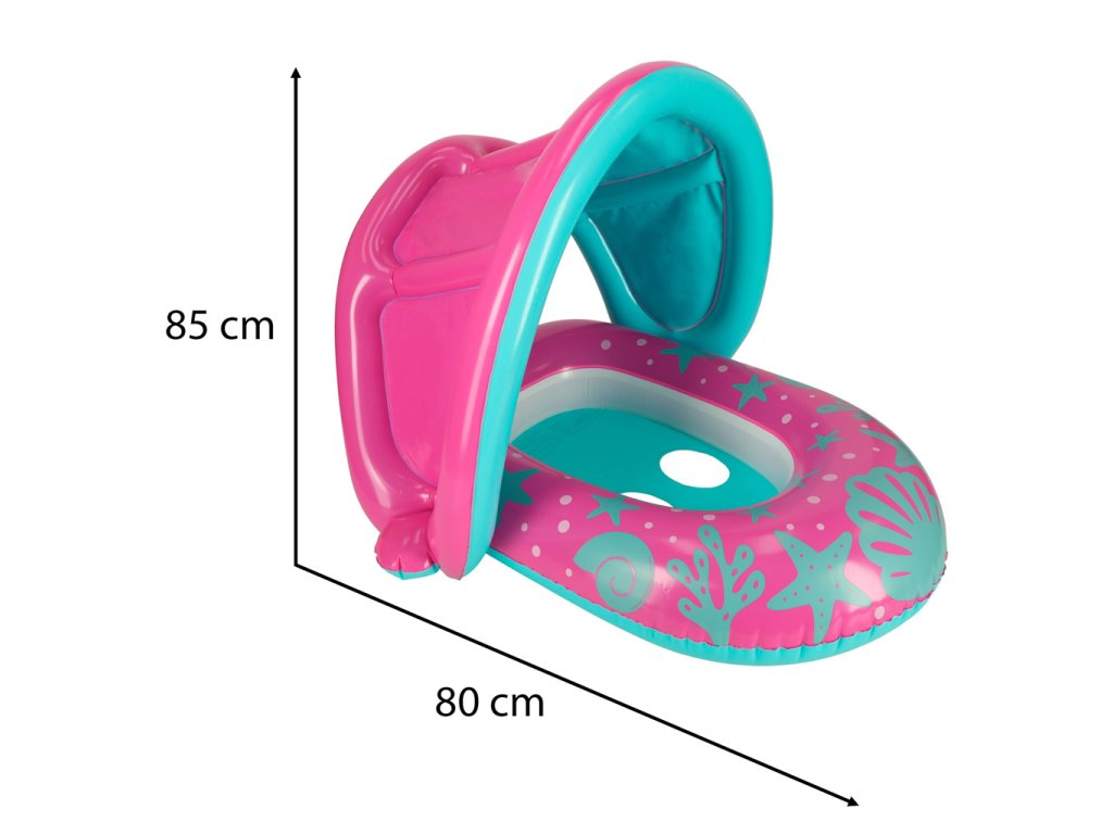 Ružové koleso so sedadlom je ideálne pre batoľa, ktoré sa práve začína učiť plávať. Vďakaotvorom na nohy bude vaše dieťa v koliesku sedieť stabilne a nevypadne z neho. Nafukovacia strieška poskytuje ochranu jemnej pokožky vášho dieťaťa pred škodlivými slnečnými lúčmi. Navyše, keď idete do bazéna, striešku môžete odňať. Koleso je vyrobené z odolného PVC, takže vydrží viac ako jednu letnú sezónu.