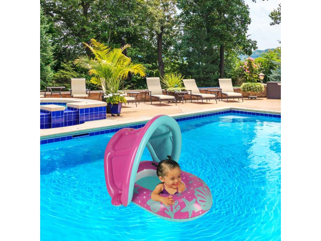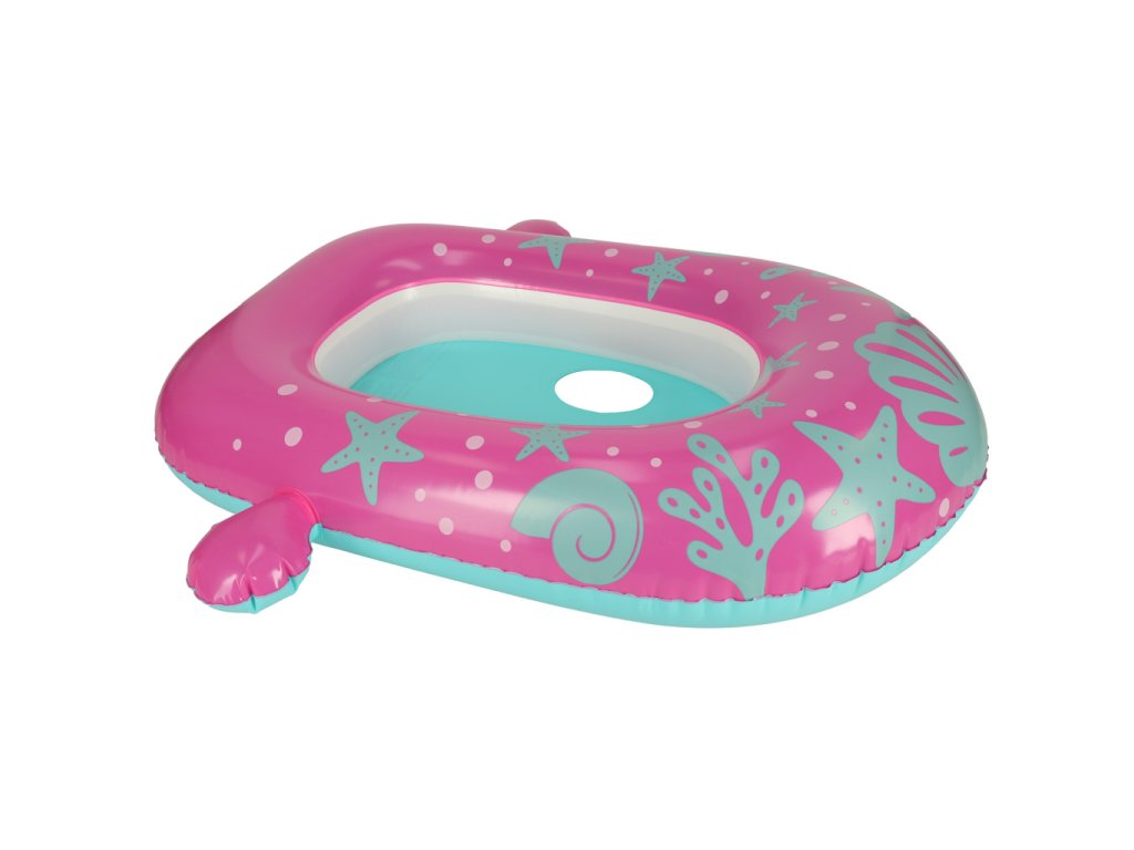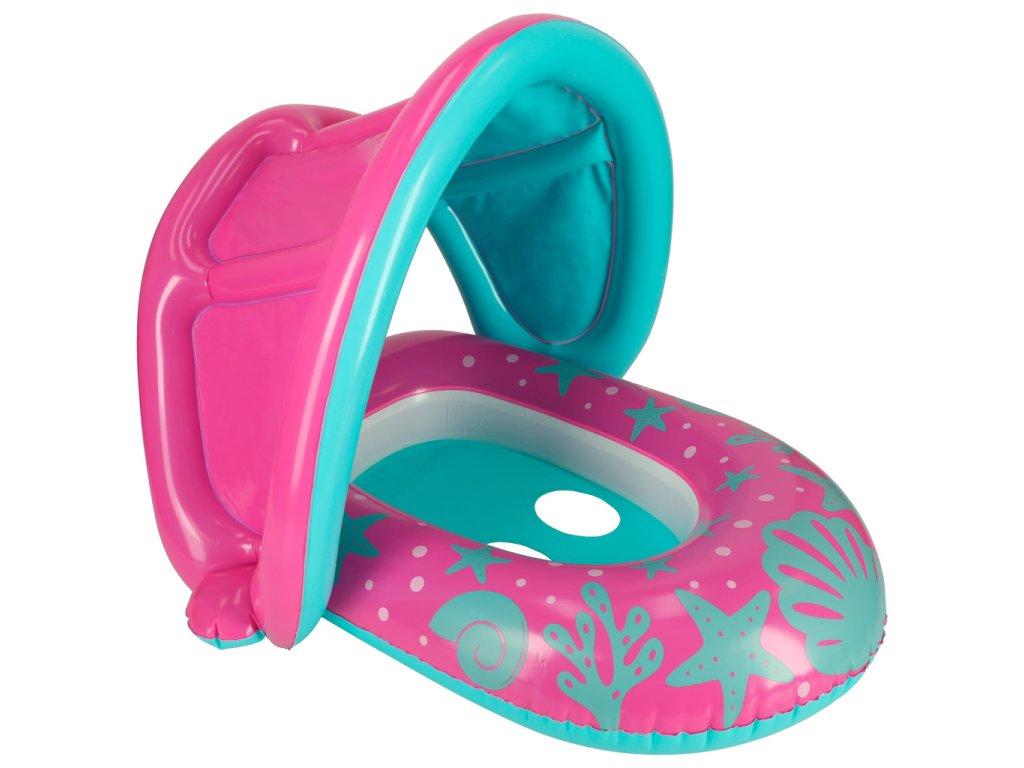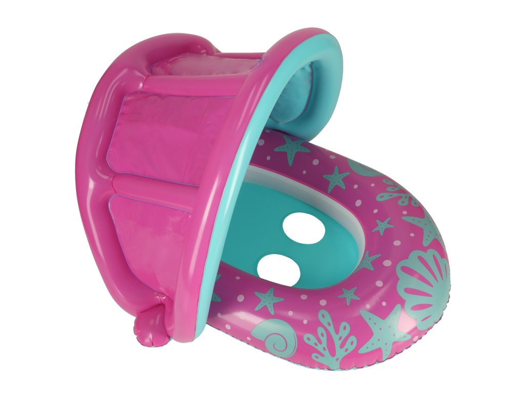Ružové koleso so sedadlom je ideálne pre batoľa, ktoré sa práve začína učiť plávať. Vďakaotvorom na nohy bude vaše dieťa v koliesku sedieť stabilne a nevypadne z neho. Nafukovacia strieška poskytuje ochranu jemnej pokožky vášho dieťaťa pred škodlivými slnečnými lúčmi. Navyše, keď idete do bazéna, striešku môžete odňať. Koleso je vyrobené z odolného PVC, takže vydrží viac ako jednu letnú sezónu.