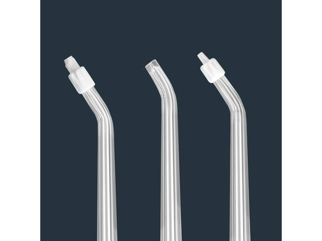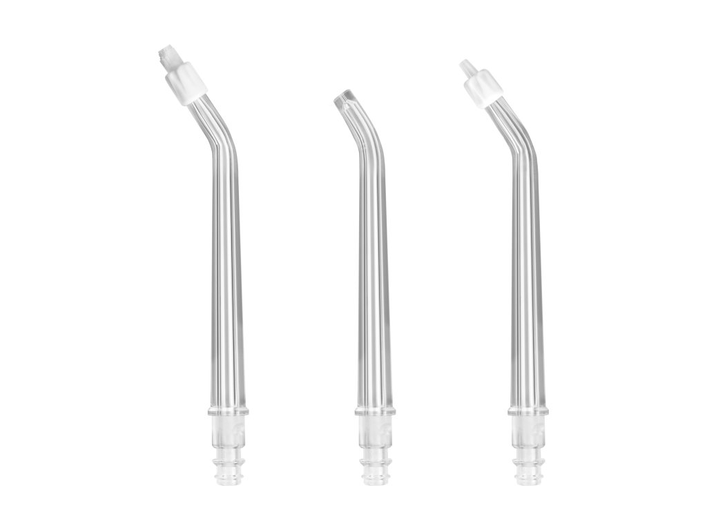 Vymeniteľné koncovky V sade nájdete tri rôzne koncovky, ktoré umožňujú prispôsobenie irigátora individuálnym potrebám. Univerzálna obyčajná koncovka je vhodná na každodenné čistenie. Jemná koncovka je určená pre osoby s citlivými ďasnami, poskytujúc im jemné, ale efektívne čistenie. Ortodontická koncovka je špeciálne navrhnutá na uľahčenie čistenia okolo zámkov a drôtov v ortodontických aparátoch.
