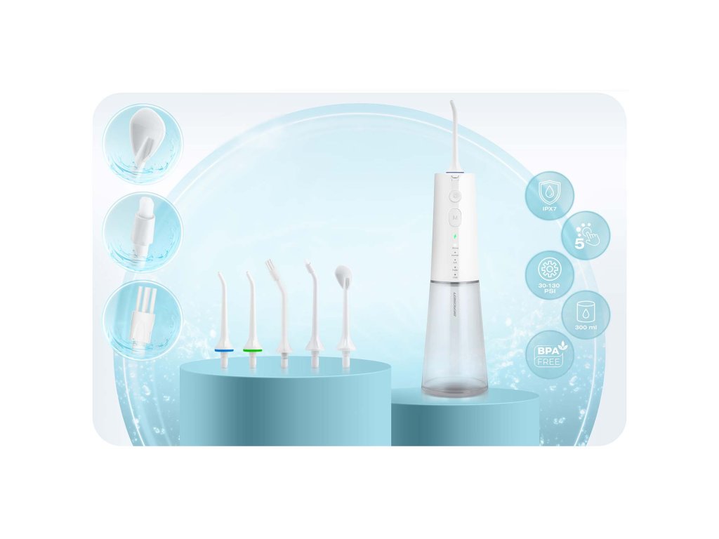 5 PRACOVNÝCH REŽIMOV | 5 NÁSTAVCOV | FREKVENCIA 1800 IMPULZOV ZA MINÚTU | ČASOVAČ | NÁDOBA 300 ML | BPA-FREE | IPX7 | CESTOVNÉ PÚZDRO | OTOČENIE TRYSIEK 360° | 30 DNÍ PRÁCE | USB-C ZADARMO