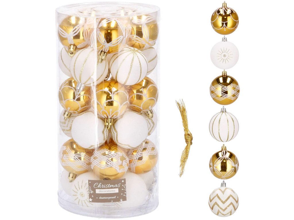 - 15x zlatá lesklá (biely vzor) – 7 cm