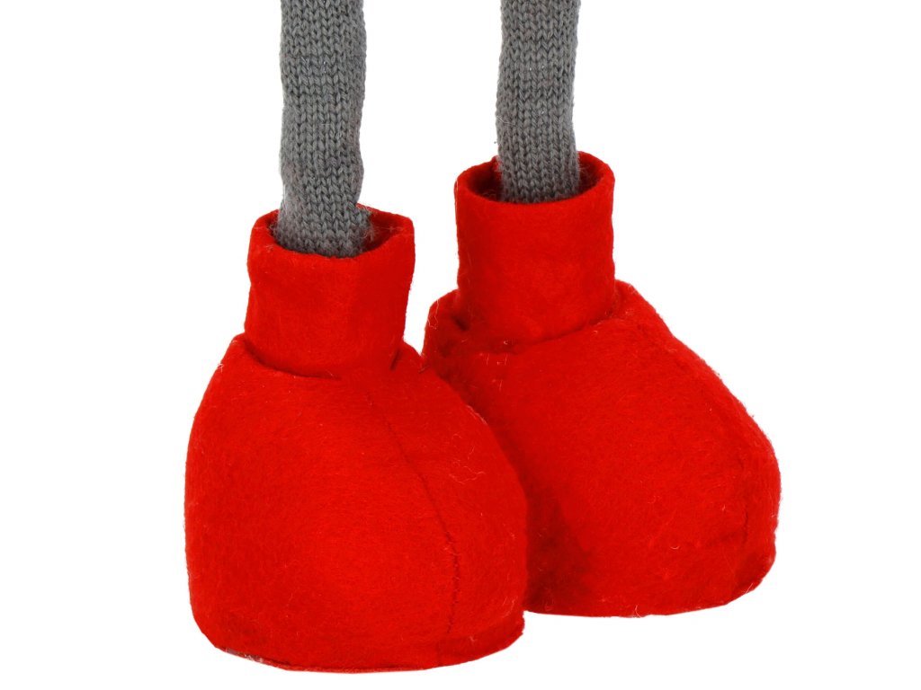 - Trup: sveter v červeno-bielych pruhoch, sivé ruky a červené topánky