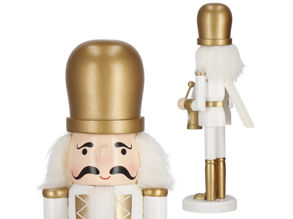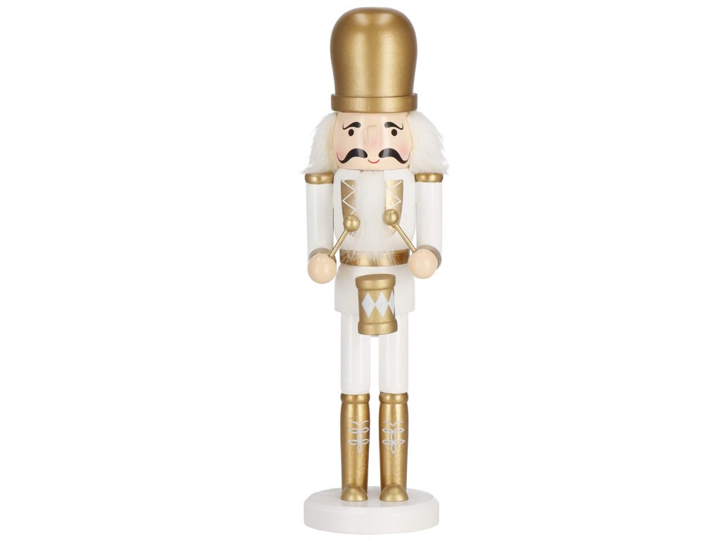 - Konštrukčné prvky: zlatá čiapka, bielo-zlaté oblečenie, zlaté topánky, tvár s očami a fúzmi, vystupujúci nos, sivé vlasy a brada, otvor na orechy v ústach otvárateľný zodvihnutím páčky vzadu, bubienok, v ruke paličky na hranie
