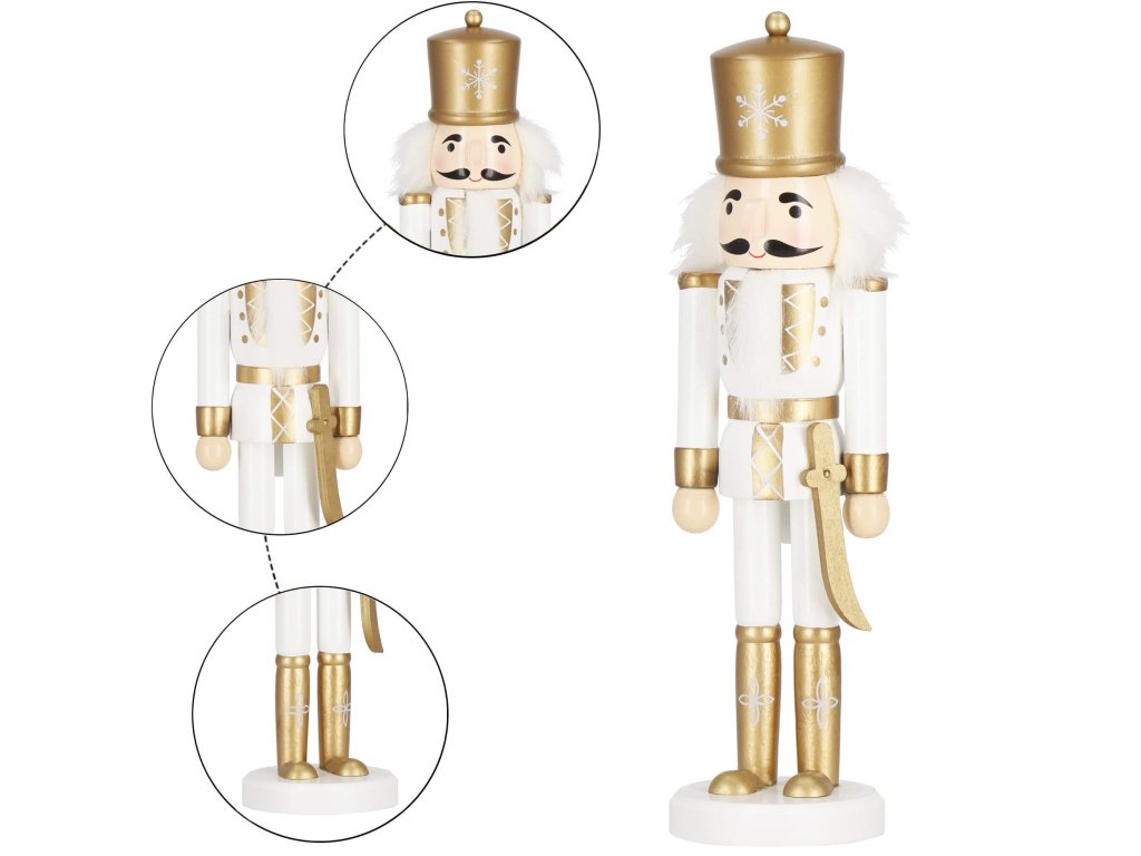 - Prvky konštrukcie: zlatá čiapka, bielo-zlatý odev, zlaté topánky, tvár s očami a fúzmi, vystupujúci nos, sivé vlasy a brada, otvor na orechy v ústach otváraný zdvihnutím páky zozadu, zlatý meč