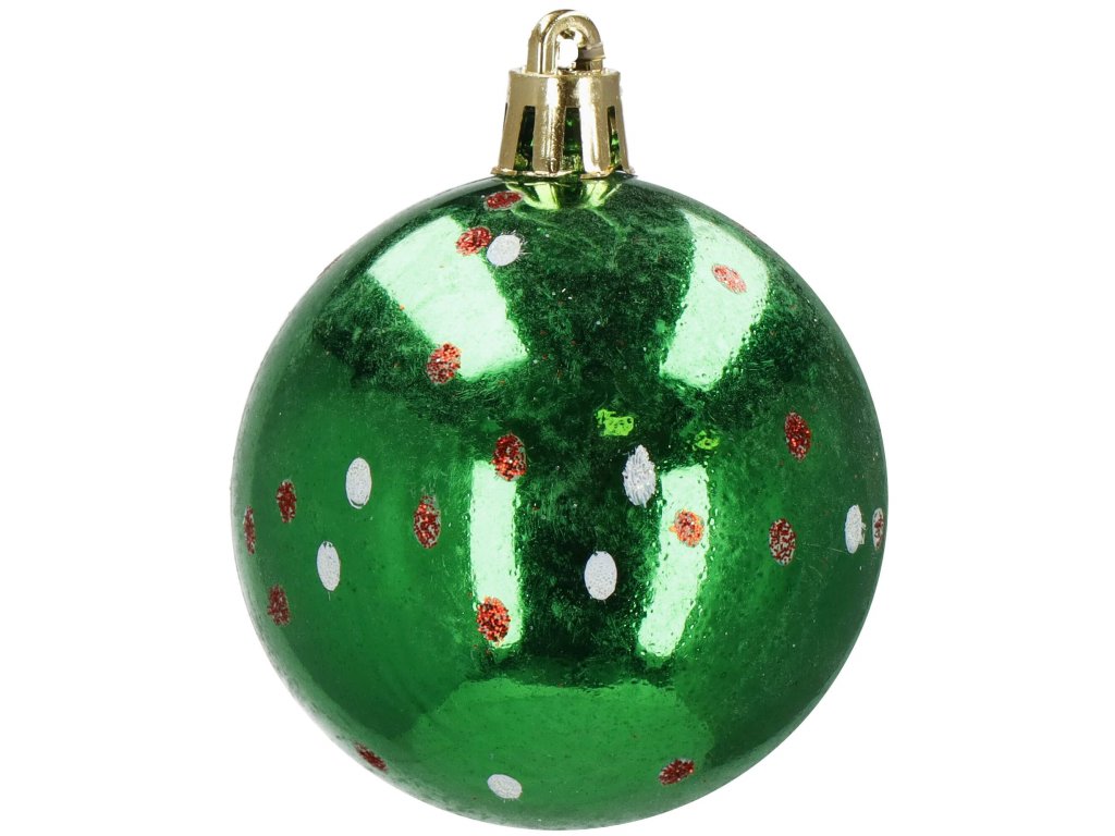 - 2x lesklá guľa - zelená + bodky z červeného a bieleho trblietania - 6 cm