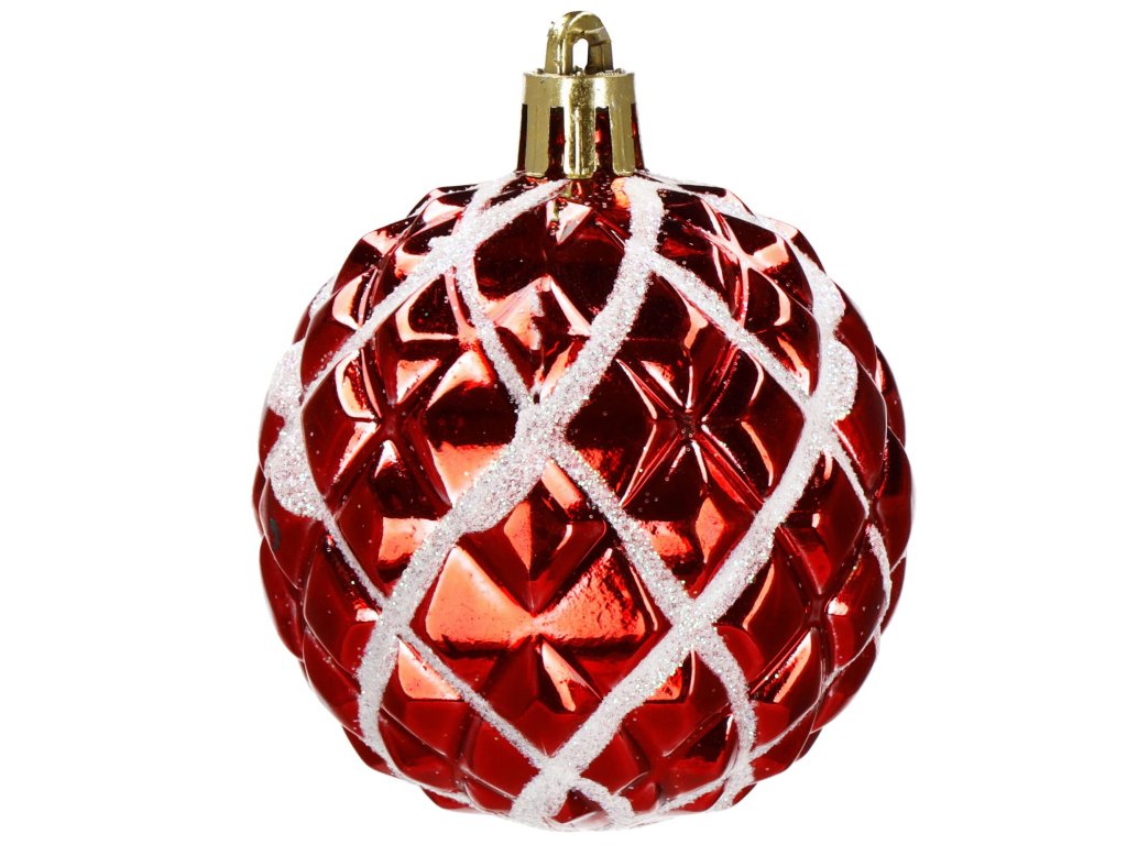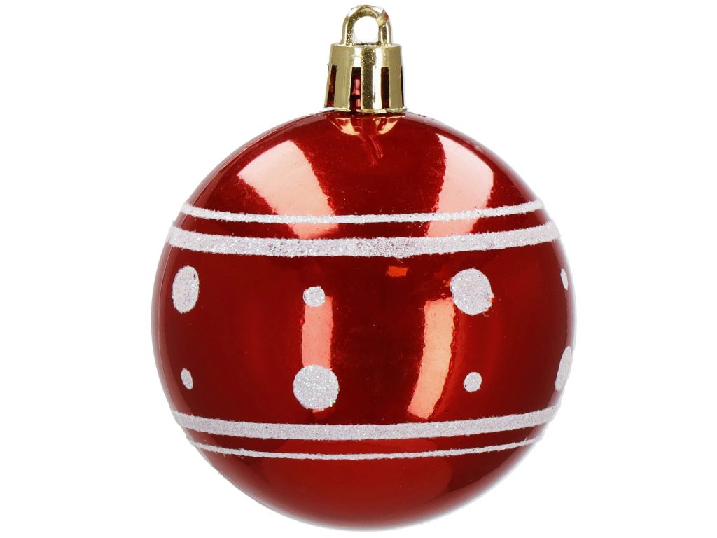 - 2x lesklá guľa - červená + bodky a línie z bieleho trblietania - 6 cm