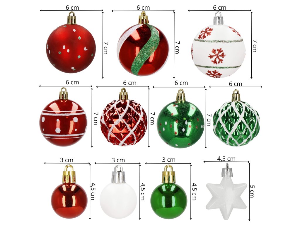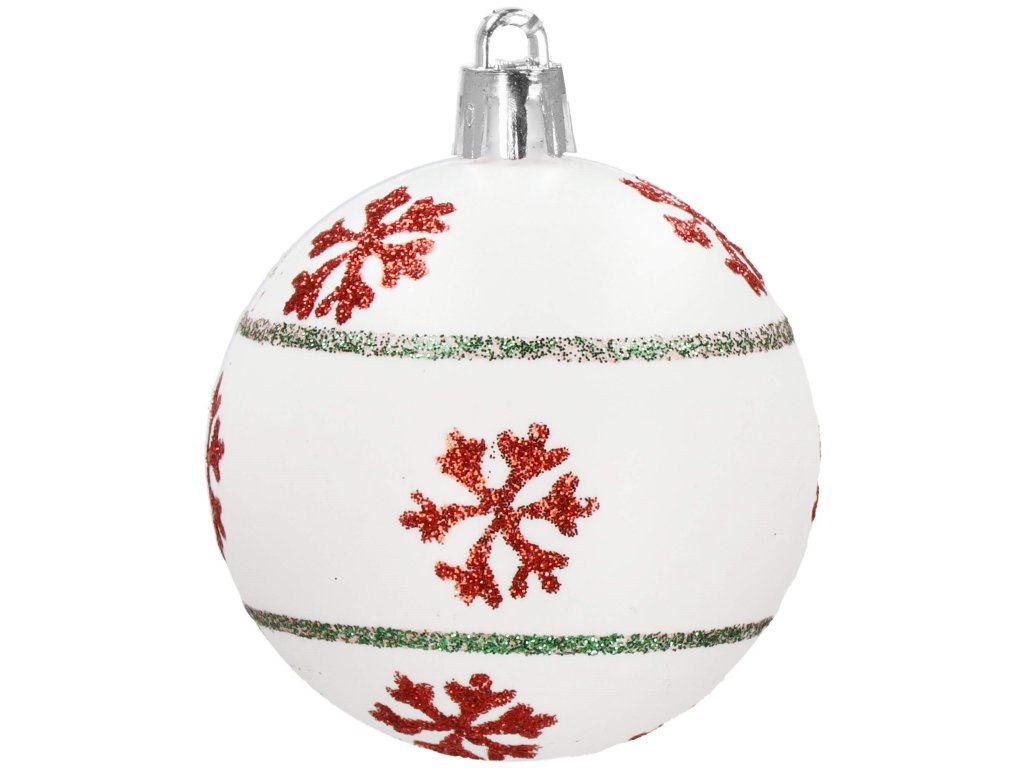 - 2x matná guľa - biela + zelené trblietavé pásiky + červené trblietavé vločky - 6 cm