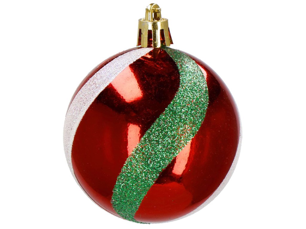 - 2x lesklá guľa - červená + pruhy z bieleho a zeleného trblietania - 6 cm