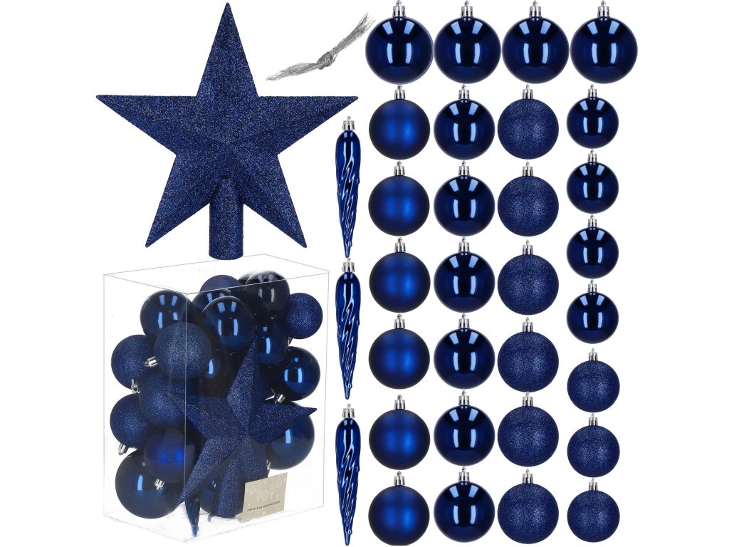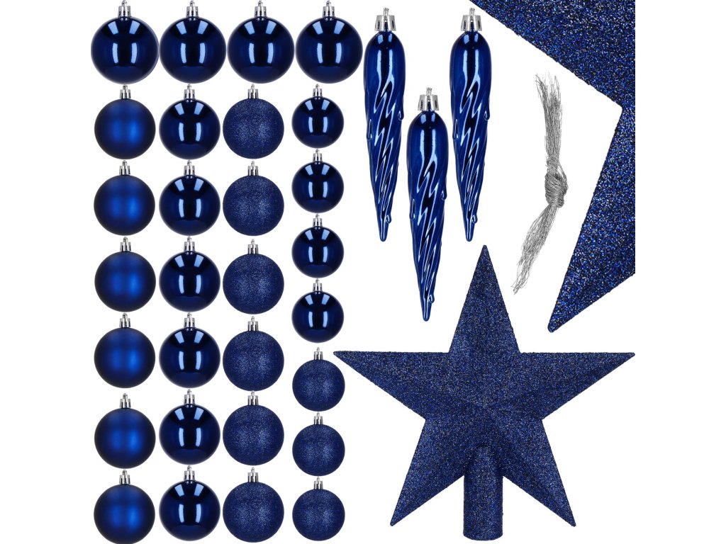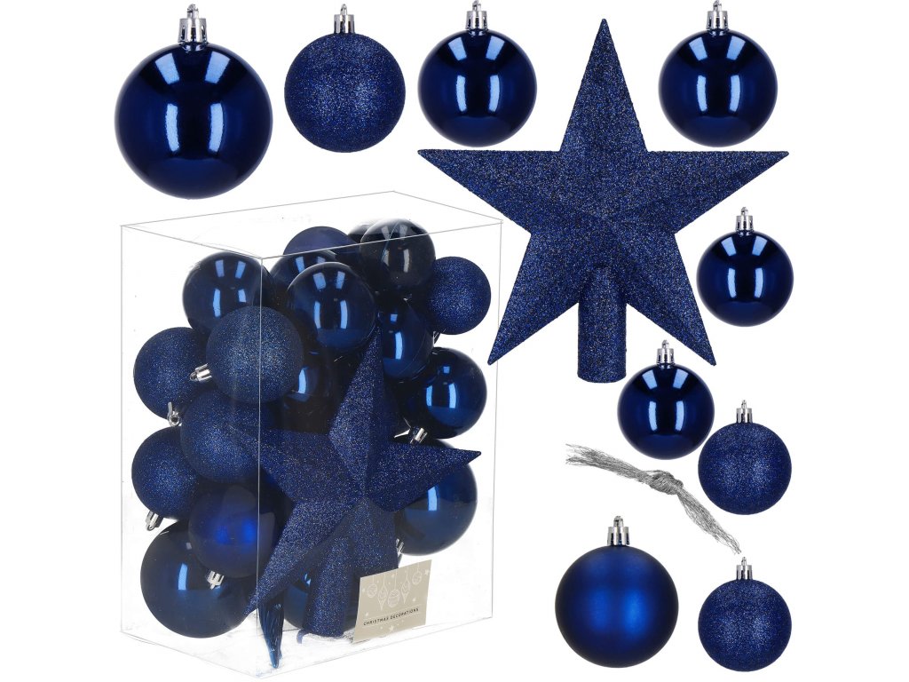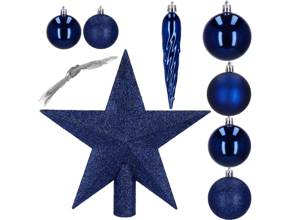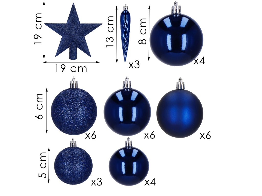 - 4x lesklá guľa - 5 cm3x trblietavá guľa - 5 cm6x matná guľa - 6 cm6x trblietavá guľa - 6 cm6x lesklá guľa - 6 cm4x lesklá guľa - 8 cm3x lesklé cencúle - 13 cm1x hviezda (vrchol na stromček) - 19 x 19 cm / priemer otvoru: 2 cm