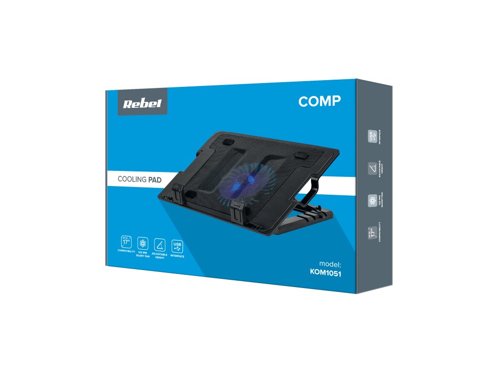 Stojan na notebook s ventilátorom s priemerom 125 mm sa vyznačuje veľmi tichou prevádzkou - hladina hluku je len 10 dB. Dôležité je, že toto príslušenstvo je vybavené portom USB, takže aj keď je napájané cez USB, neobmedzuje funkčnosť vášho notebooku. Chladiaca podložka zo série Rebel nielen predĺži životnosť vášho počítača, ale bude aj skvelým estetickým doplnkom vašej kancelárie. Čierny štíhly dizajn je doplnený modrým podsvietením ventilátora, ktoré dodáva stojanu moderný vzhľad. Okrem toho má 5-polohové nastavenie uhla sklonu, takže si môžete polohu notebooku prispôsobiť svojim potrebám.