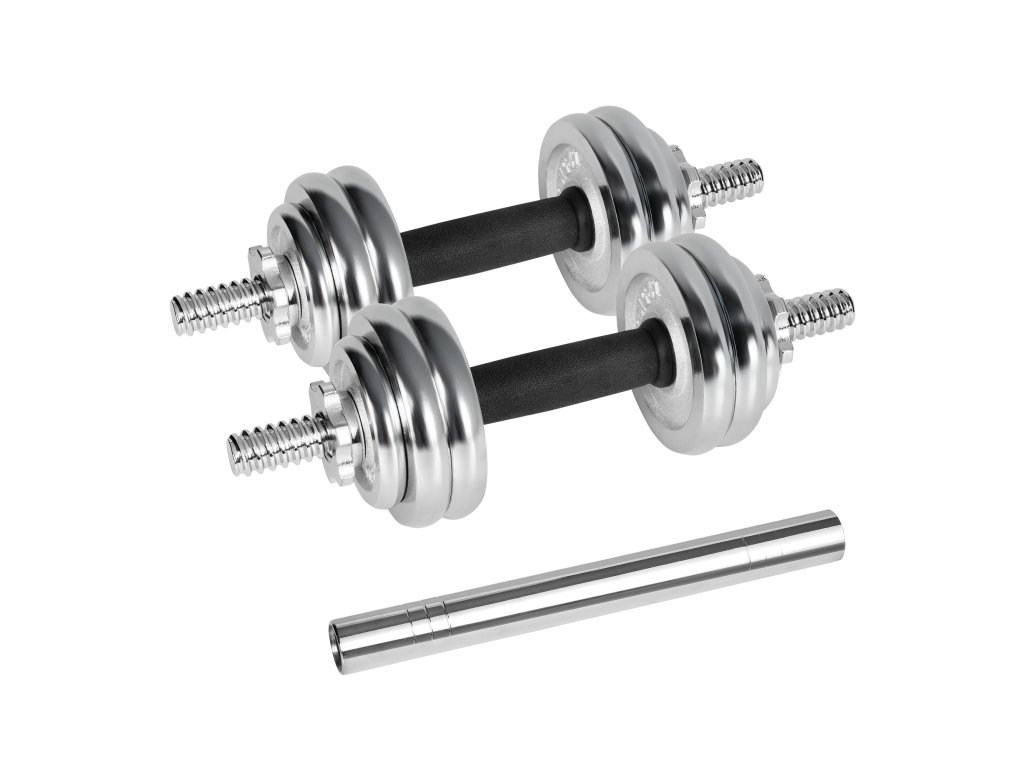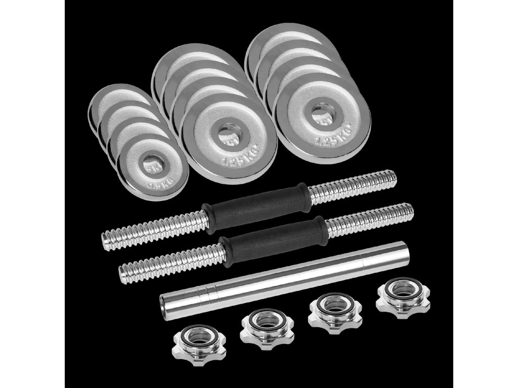 Súprava je vyrobená z vysoko kvalitnej liatiny, pokrytej trvácnym chrómovým povlakom, ktorý chráni pred koróziou, škrabancami a mechanickým poškodením. Chróm dodáva činkám elegantný vzhľad a zvyšuje ich životnosť aj pri intenzívnom používaní.