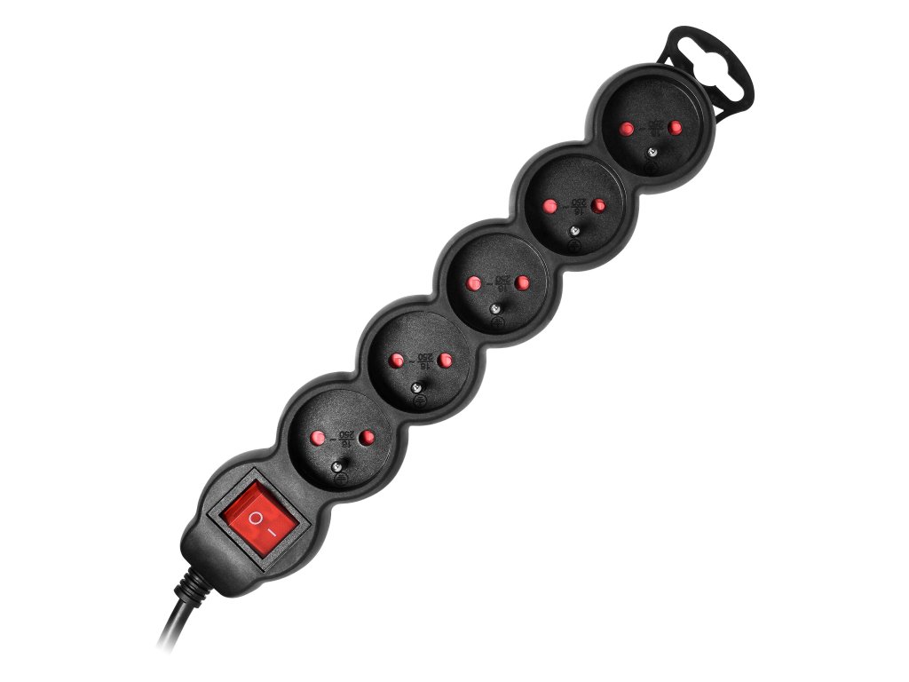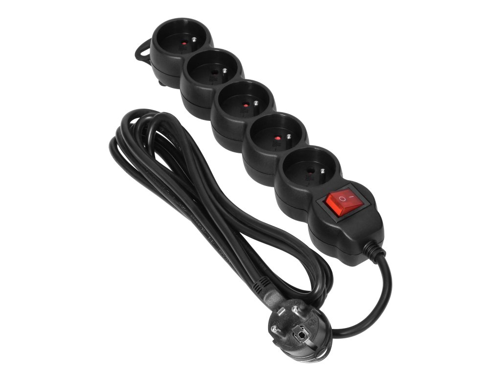 Čierny predlžovací kábel s 5 zásuvkami a vypínačom 3m