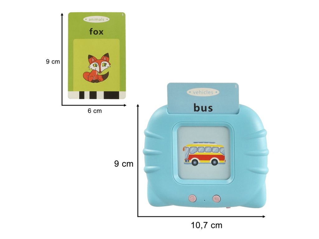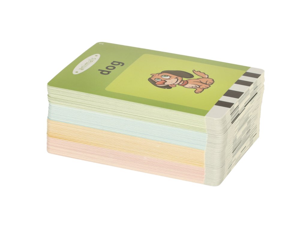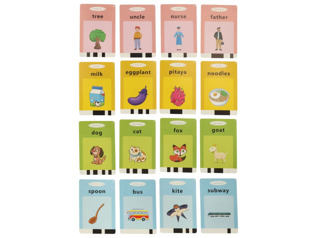 Každá karta má dve vopred nahraté slová, jedno na každej strane, a zodpovedajúcu kresbu na pochopenie ich významu. Tým sa stimuluje zrak aj sluch dieťaťa, takže určite vyhovuje najefektívnejšiemu spôsobu učenia pre každé batoľa.