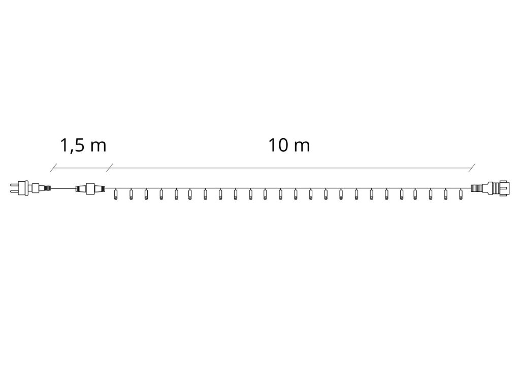 - Dĺžka súpravy: 11,5 m (svetelný úsek 10 m + kábel + zástrčka)
