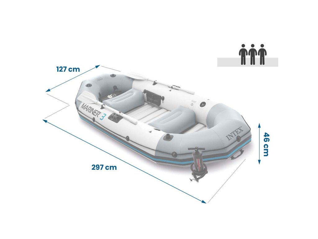 - Jeho impozantné rozmery sú 297 x 127 x 46 cm zabezpečia komfort a voľnosť až pre 3 osoby. Čln je schopný vydržať zaťaženie až do 400 kg.