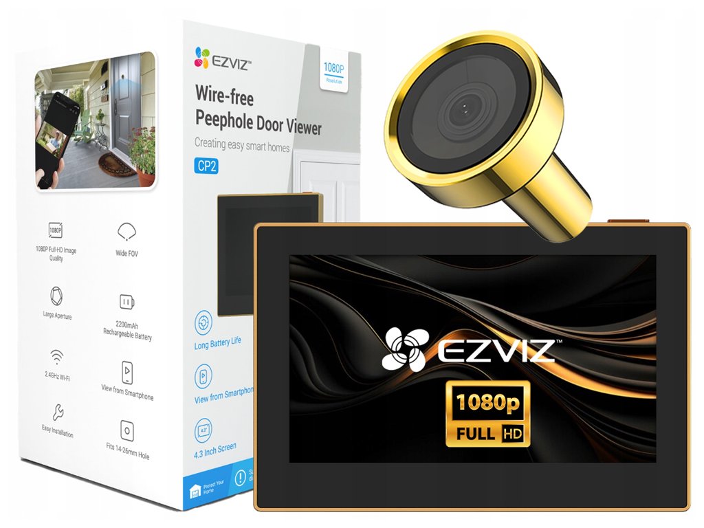 CP2 Gold je inteligentný priezor WiFi vďaka ktorému sa budete cítiť bezpečne a iste majúc plnú kontrolu nad tým, čo sa deje pred Vašimi dverami. Je vybavený kamerou Full HD s rozlíšením 1920 x 1080, ktorá zabezpečuje vynikajúcu kvalitu obrazu a dotykovým displejom 4,3". Je vybavený lítiovou batériou s kapacitou 2200 mAh. Umožňuje diaľkové ovládanie pomocou aplikácie Ezviz.