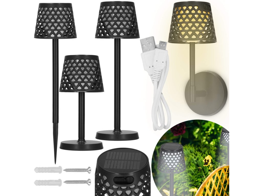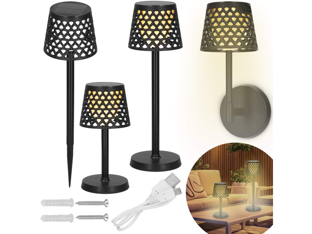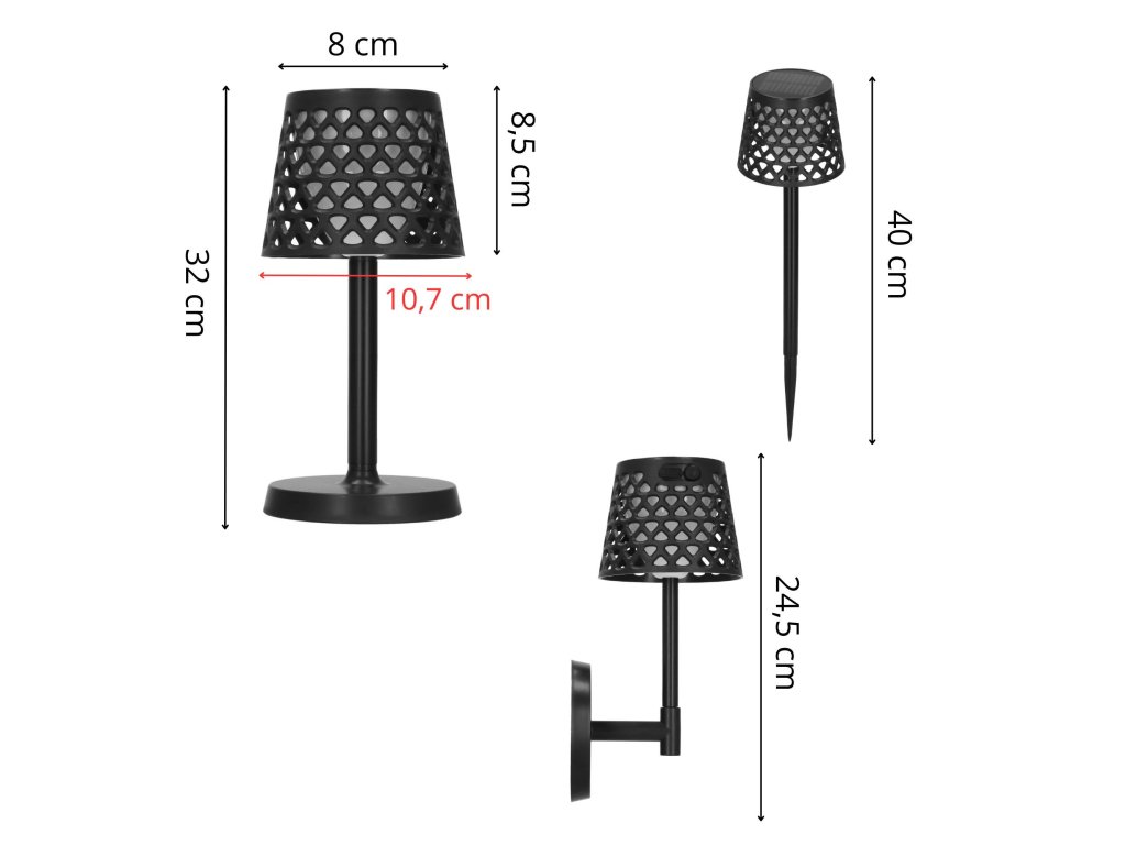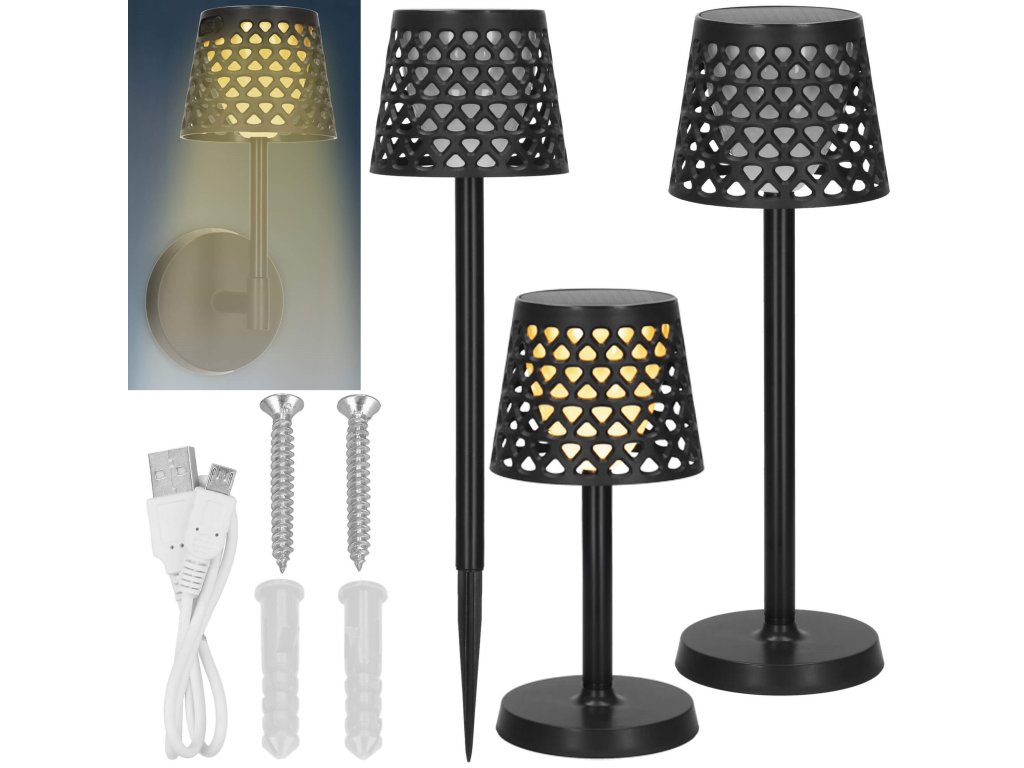 - Možnosť zloženia troma spôsobmi: 1) stojaca lampa, 2) nástenná lampa, 3) lampa zapichnutá do zeme