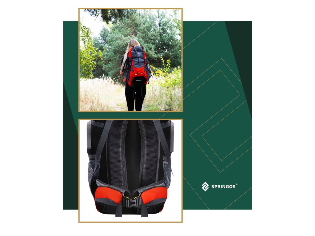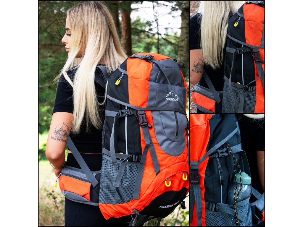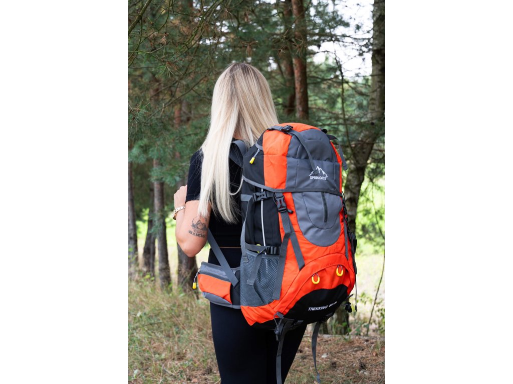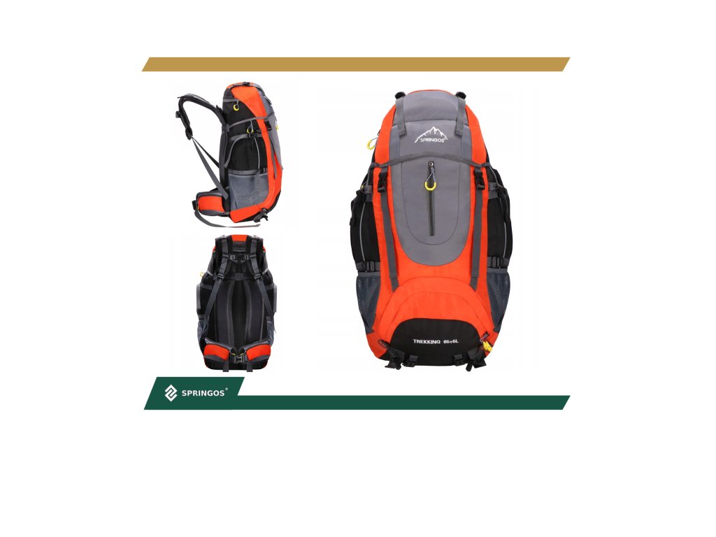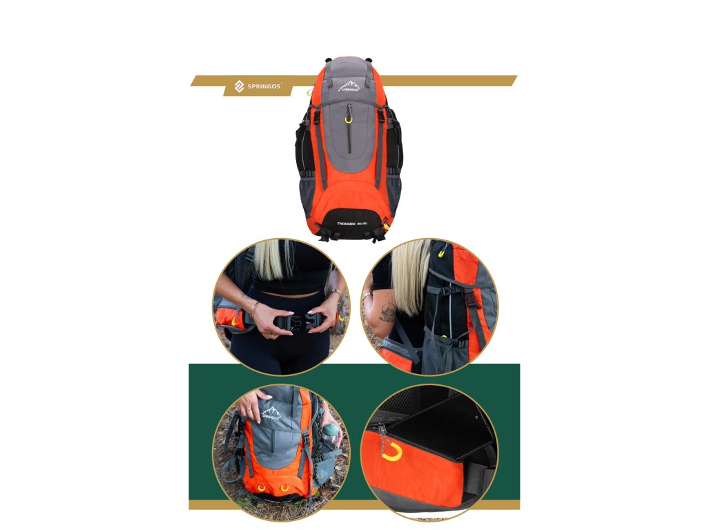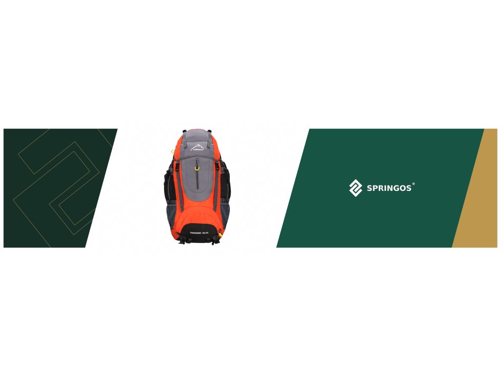 - V hornej časti vpredu klapy vyšívané biele logo Springos, v spodnej časti nápis TREKKING 65+5L.